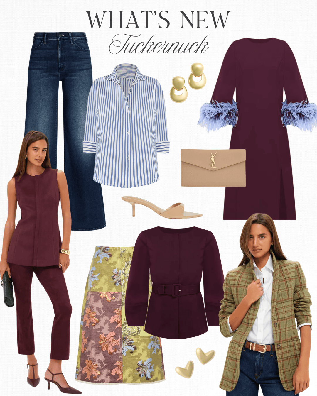 Mother jeans | Stripe shirt | Earrings | Feather dress | Burgundy vest & trousers | Clutch | Sandals | Skirt | Burgundy jacket | Heart earrings | Plaid blazer