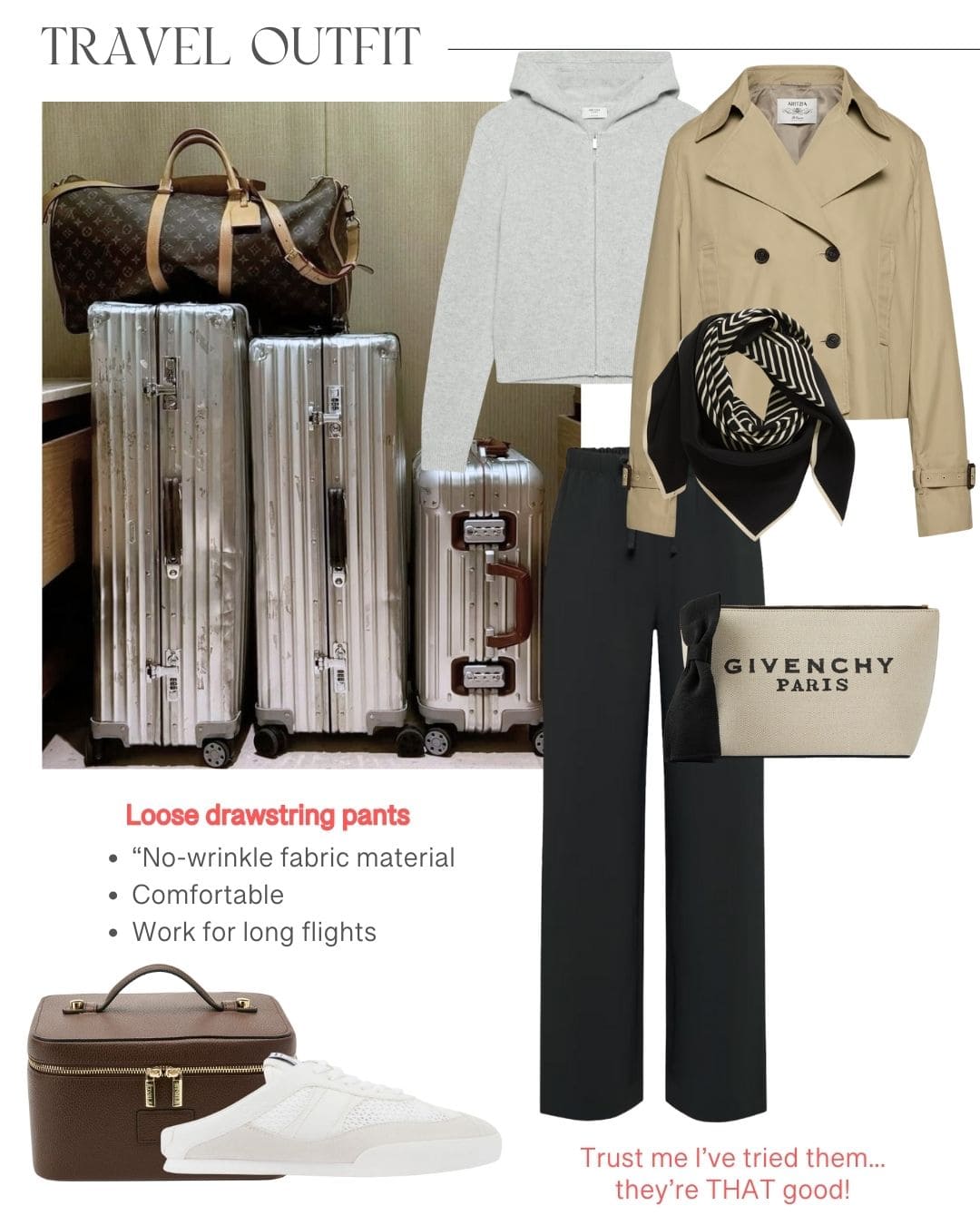 Left: Striped top | Fleece jacket | Rag & Bone sweatpant jeans | Sneakers | Scarf | Right: Cropped trench | Zip cashmere hoodie | Sneaker | Givenchy pouch | Pants | Cosmetic bag | Scarf