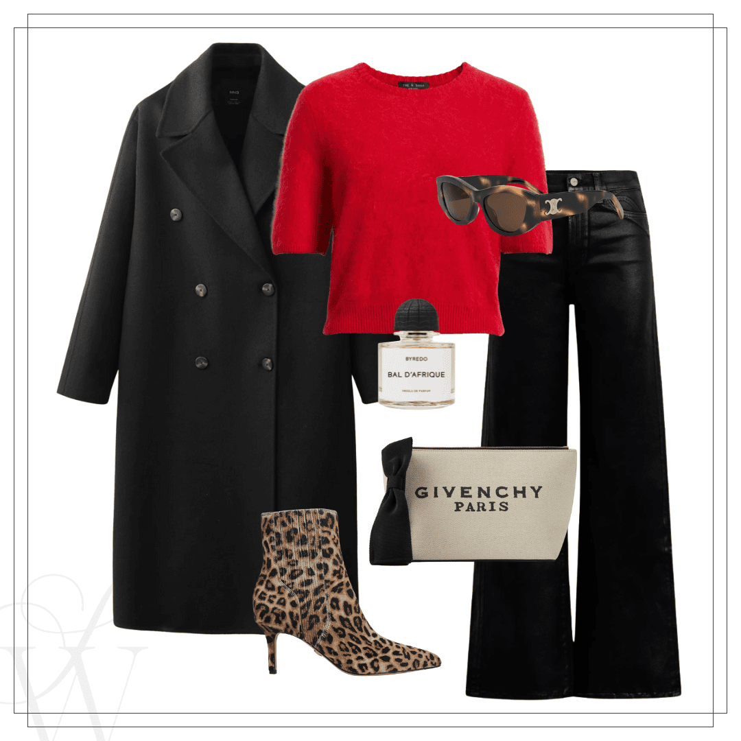 Wool coat | Red knit | Coated Anessa jeans | Givenchy pouch | Veronica Beard booties | Sunnies | Perfume