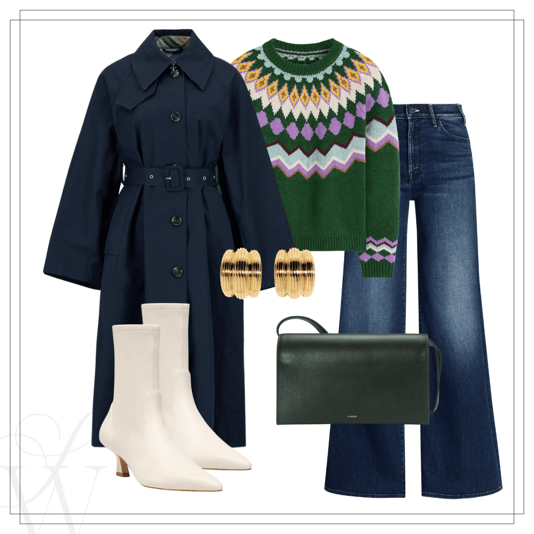 Navy trench | Fair isle sweater | Wide leg jeans | Bag | Ivory booties | Earrings