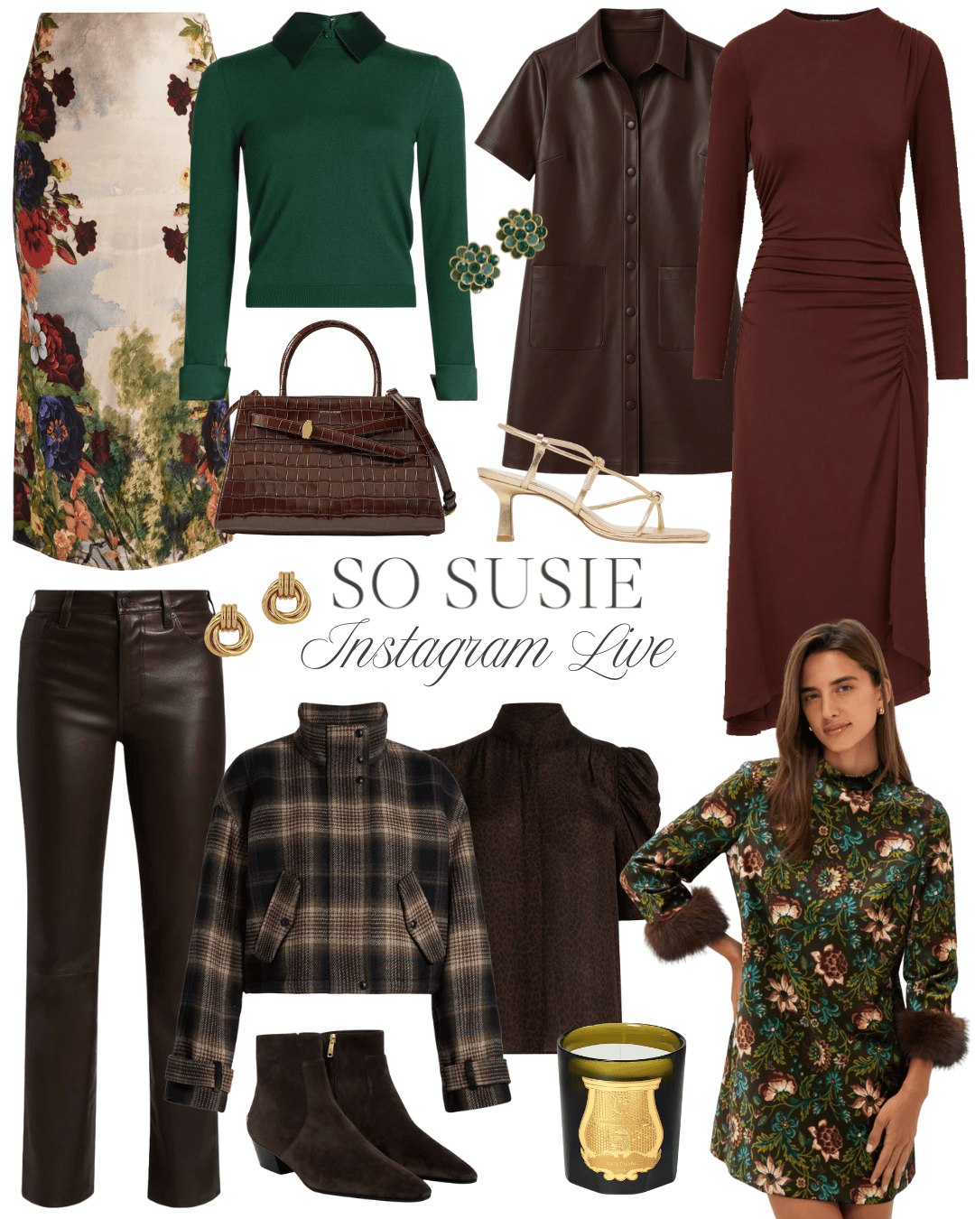 Row 1: Alice & Olivia skirt | Green sweater | Faux leather dress | Veronica Beard knit dress | Dash bag | Green earrings | Gold sandals