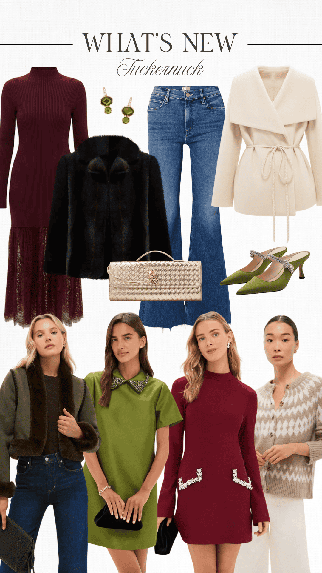 Bottom row: Fur trim jacket | Green dress | Burgundy dress | Fair Isle sweater