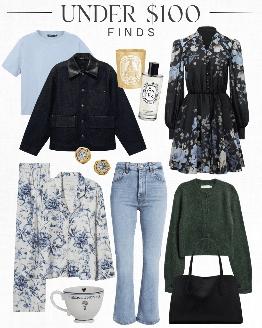 Blue sweater | Denim jacket | Candle | Perfume | Dress | Pajamas | Earrings | Coffee cup | Frame jeans | Green cardigan | Tote