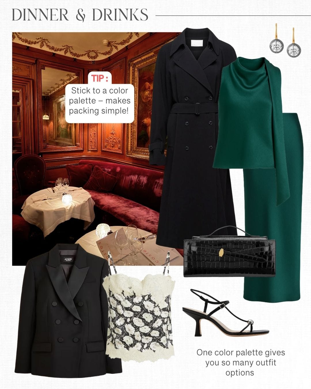 Left: Wrap coat | Embellished sweater | Jeans | Watch | Loafers | Earrings | Handbag | Right: Trench | Green top & skirt | Blazer | Cami | Sandals | Clutch | Earrings
