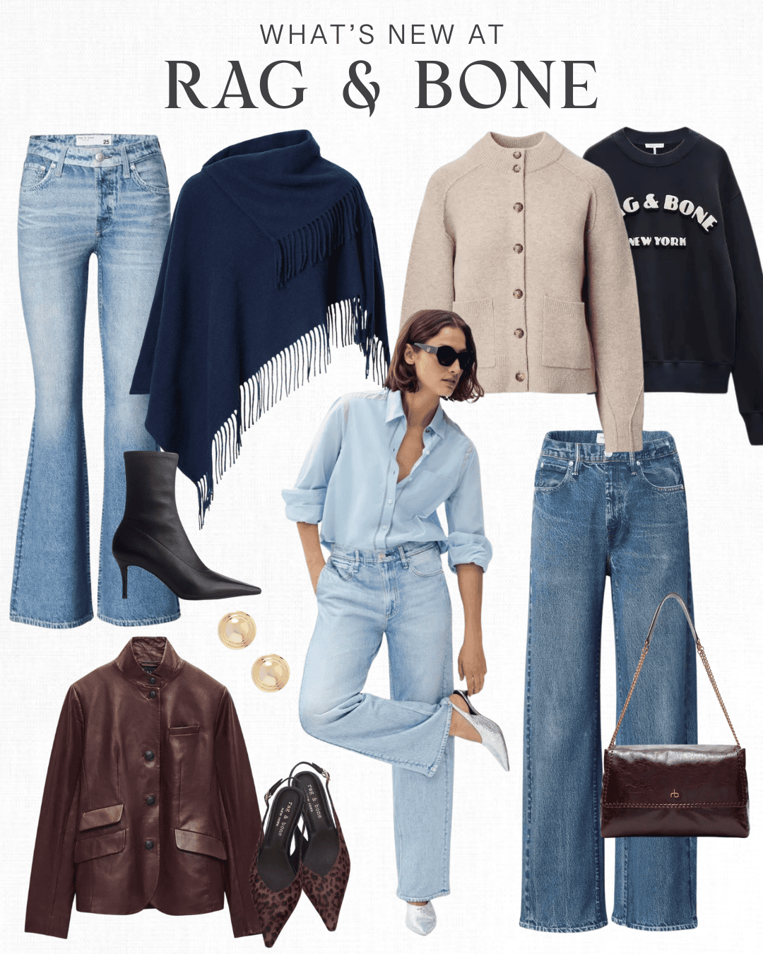 Top row: Flare jeans | Poncho | Cardigan | Crewneck sweatshirt | Black bootie