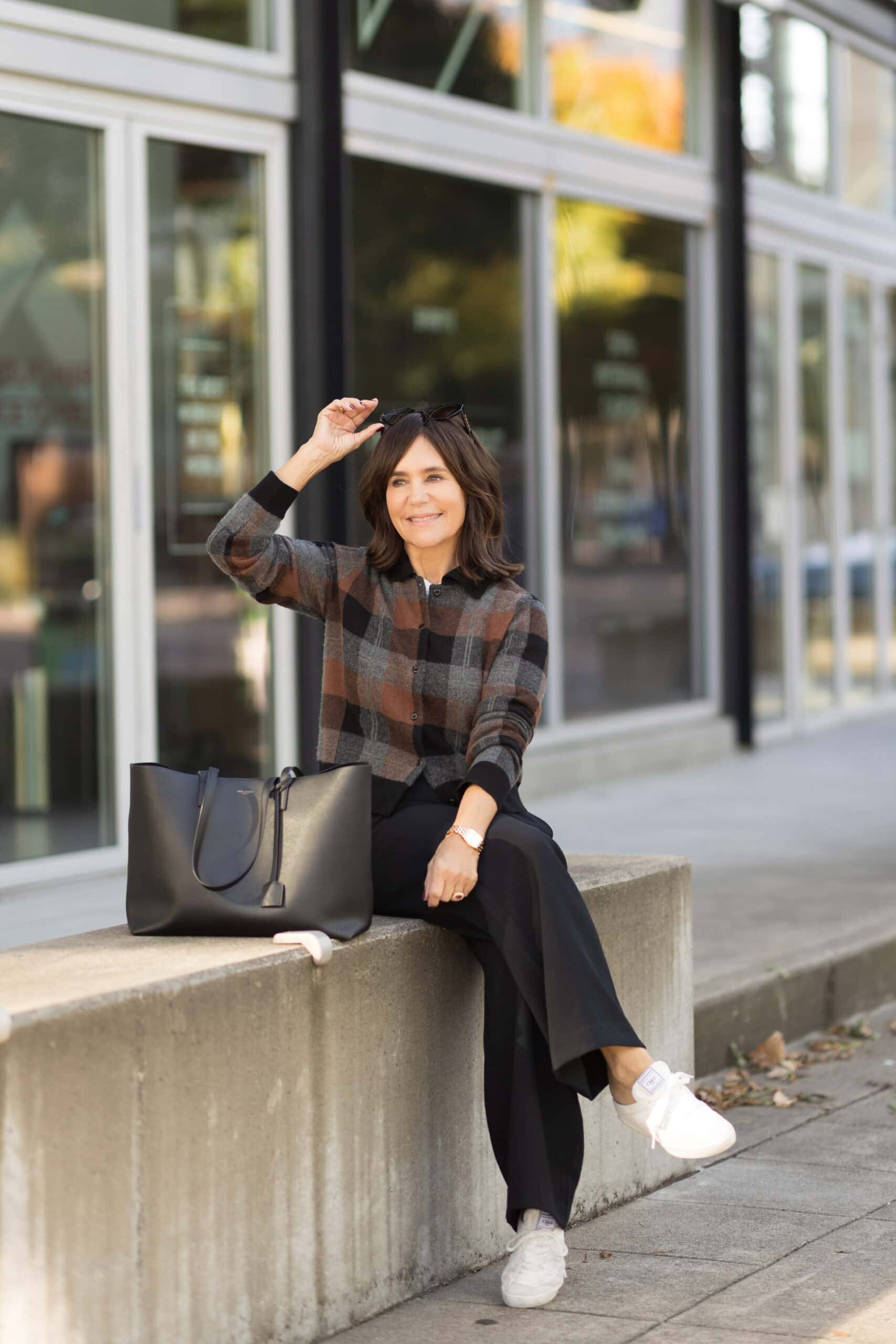 Left: Plaid Vince cardigan | Black pant | Chloe sneakers | YSL tote | Middle: Faux leather dress | Ivory coat | Sandals | Chanel bag (similar) | Right: Leather bomber jacket | Sandals | Ivory bag
