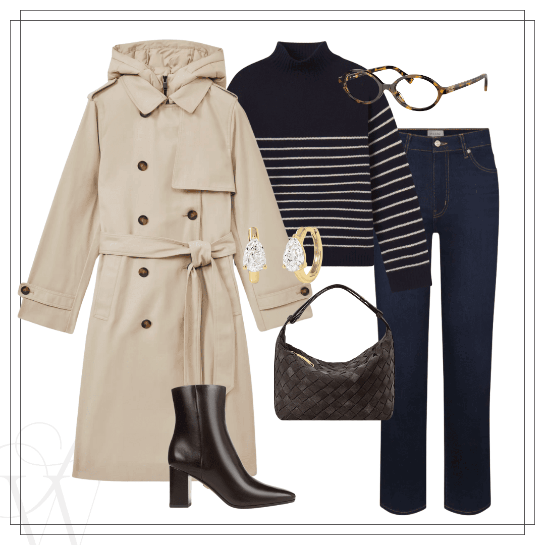 Trench | Stripe sweater | Frame jeans | Boots | Amazon bag | Ring Concierge earrings | Eyewear