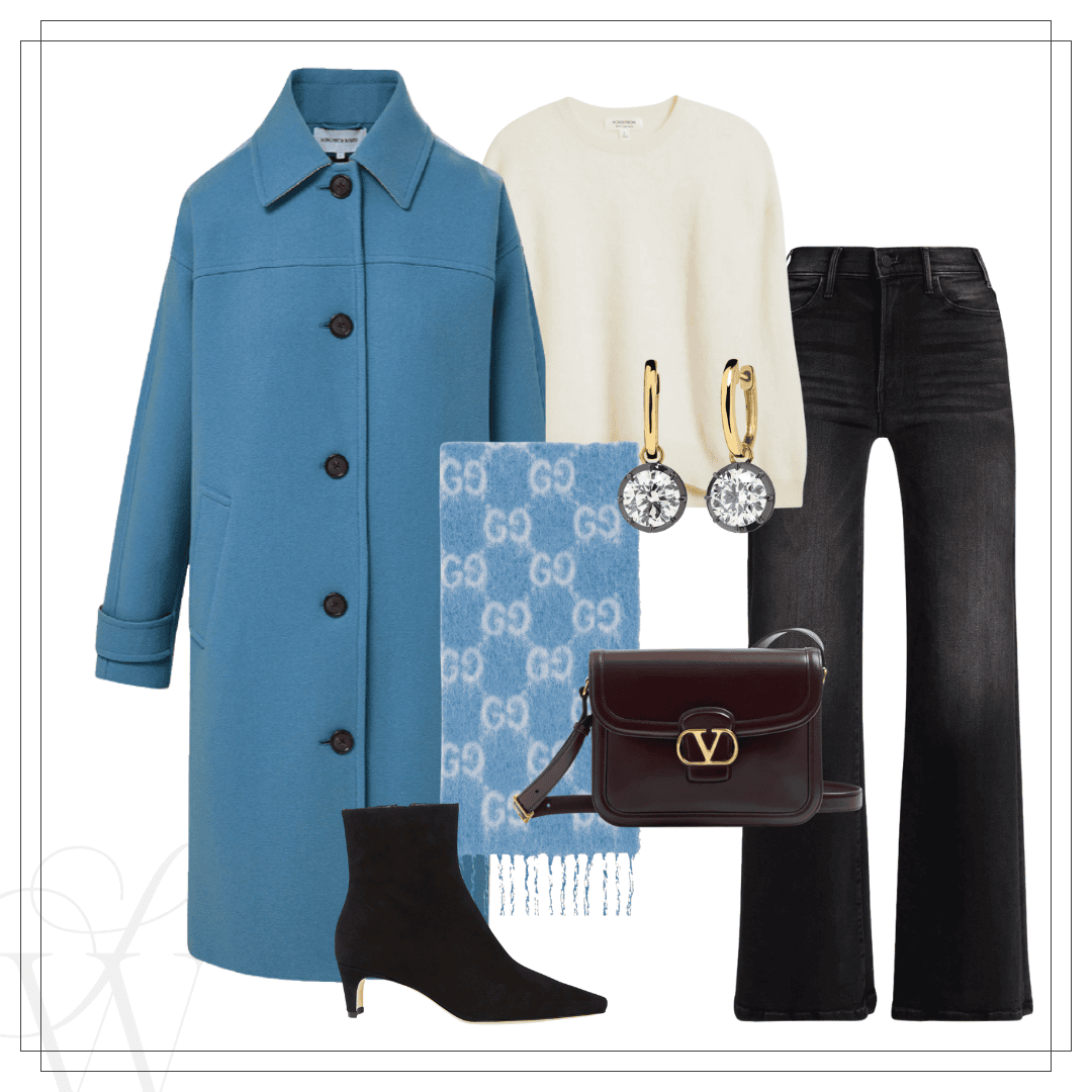 Veronica Beard coat | Gucci scarf | Sweater | Earrings | Valentino bag | Mother jeans | Staud Wally boot
