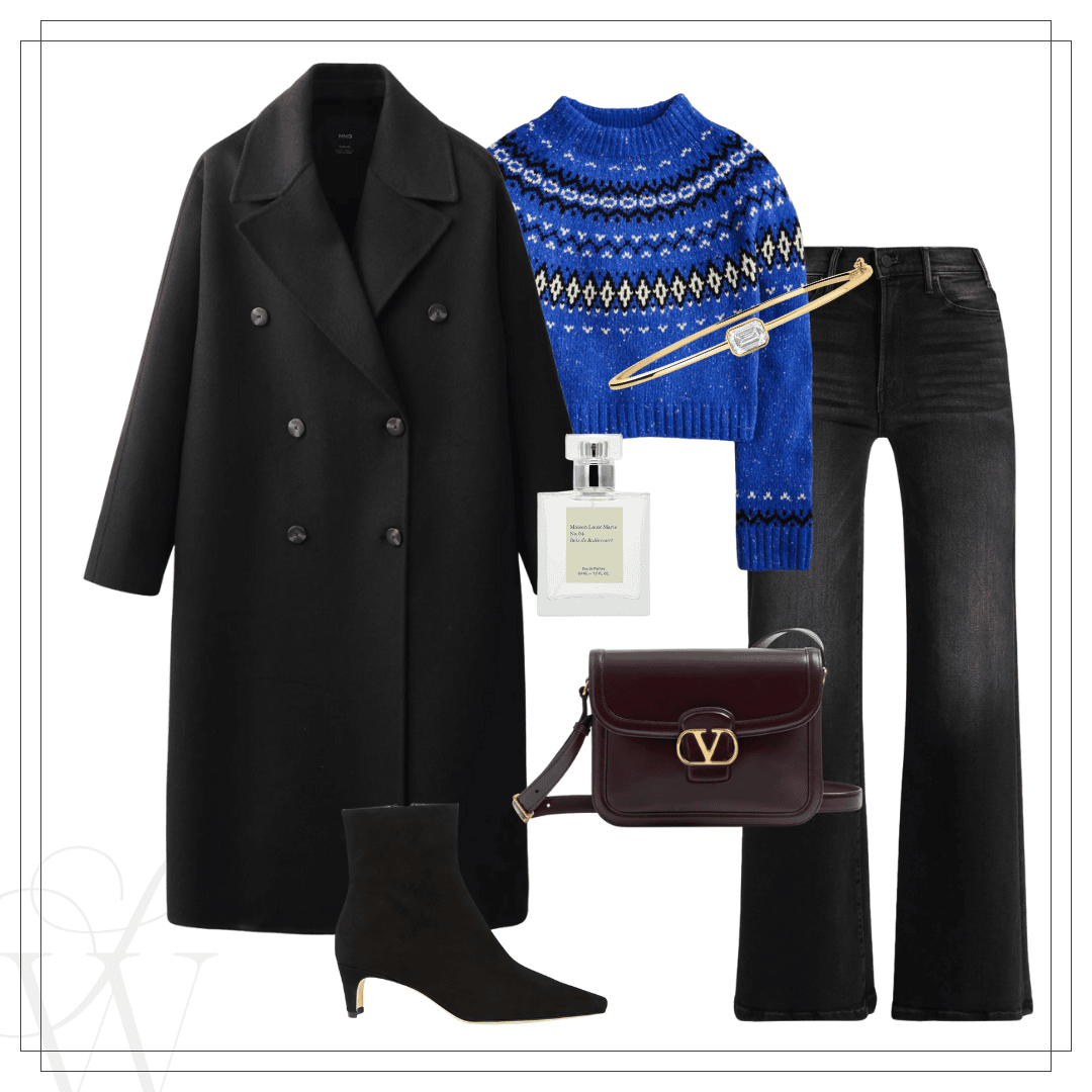 Mango coat | Fair isle sweater | Valentino bag | Mother jeans | Staud Wally boot