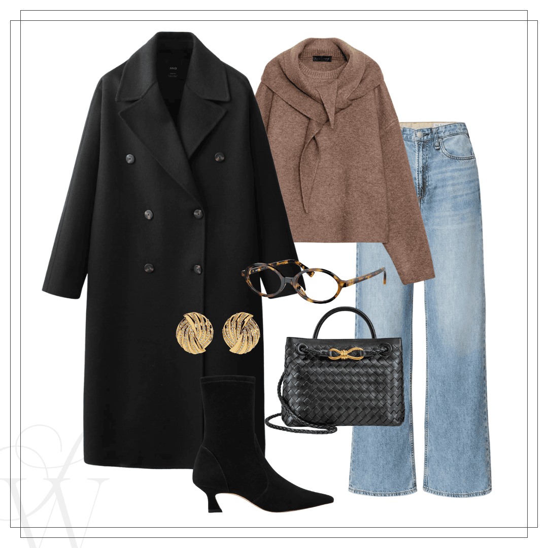 Mango coat | Rag & Bone jeans | Amazon bag | Scarf sweater| Earrings | SW boots