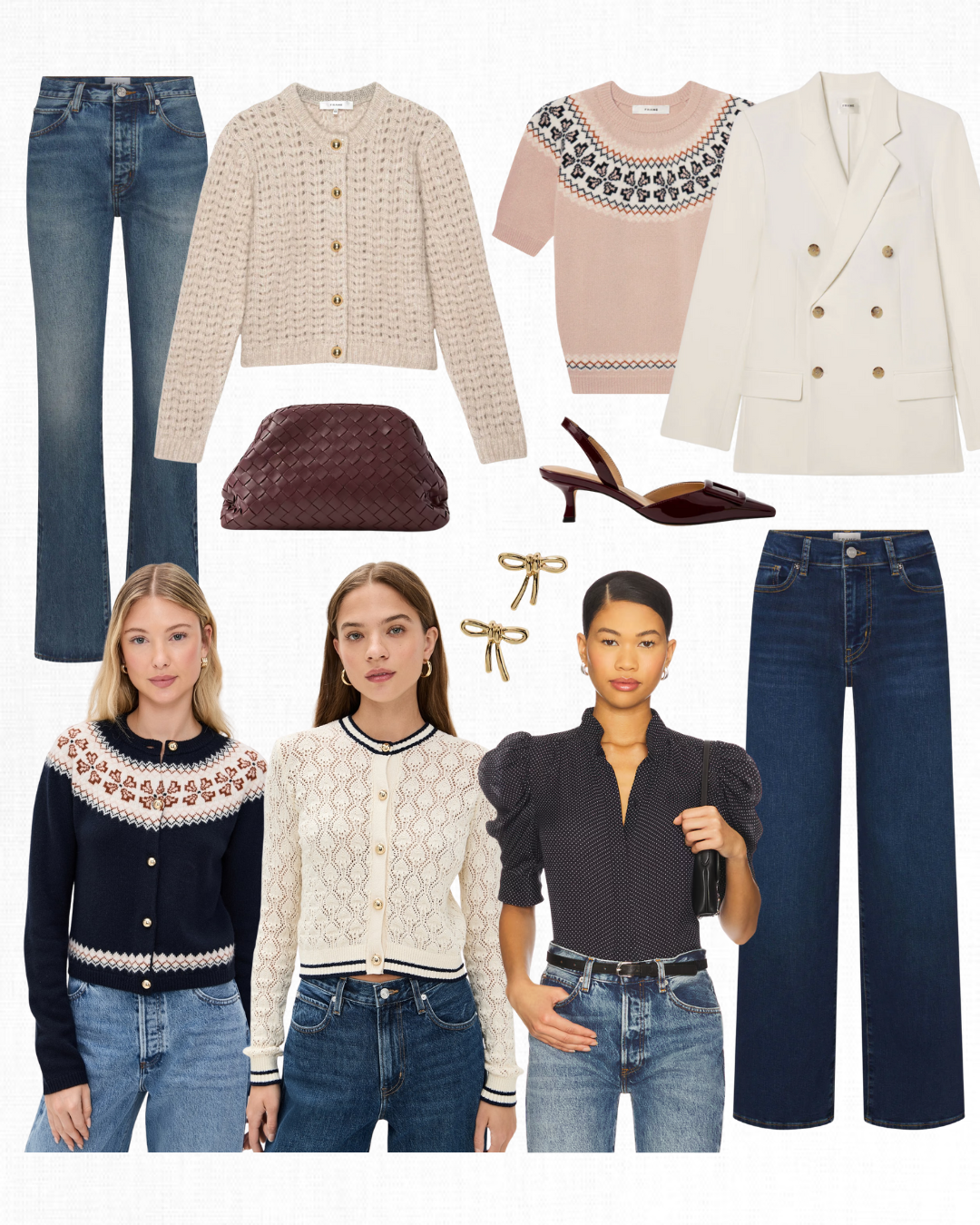 Susie: Sweater | Jeans | Right: Jeans | Cardi | Fair isle sweater | Blazer | Clutch | Slingback | Bow earrings