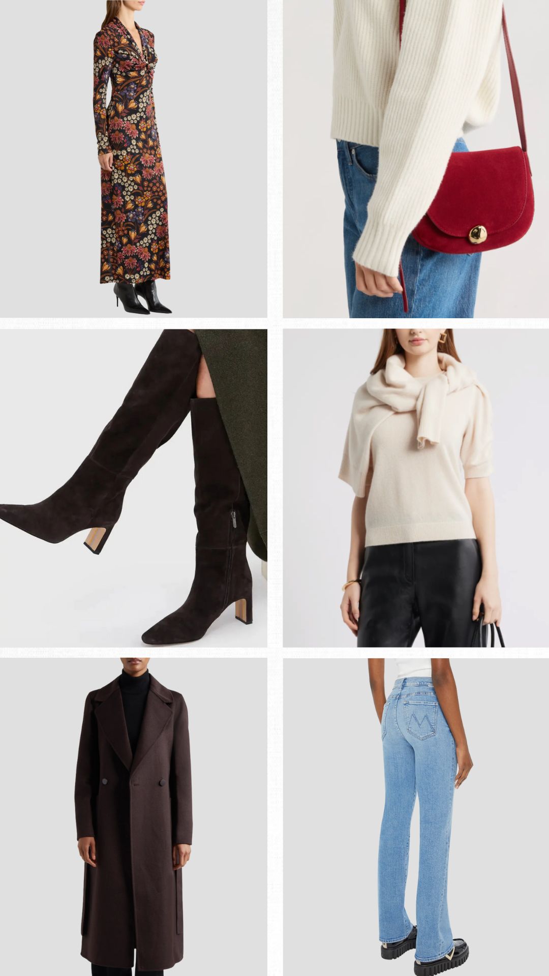 4 – Farm Rio knit dress – Farm Rio is a favorite brand, and this gorgeous print is so charming! It’s the perfect style of dress to pair with boots, and you’ll wear it well into the next year layered with a coat or a cozy sweater. 5 – Madewell bag – Madewell bags are a great value for the price, and many of the styles including this one are inspired by high end designers. I’ve been carrying this tote all season, and the quality is excellent. 6 – Sam Edelman Sylvia boots – This gorgeous knee boot is well-priced and very popular. The heel height is perfect, and it also looks like a designer boot at a fraction of the price. It’s available in wide-calf, and some colors are on sale. My preference is the chocolate brown or black suede — both look super luxe.