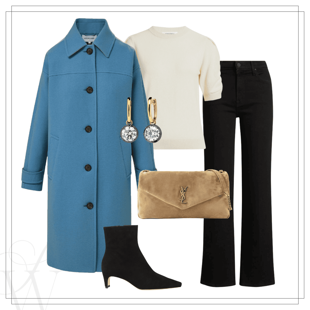 Left: Vince coat | Blouse | Jeans | Bag | Slingbacks | Right: Black coat | Pistola jeans | Boots | Bag | Sweater