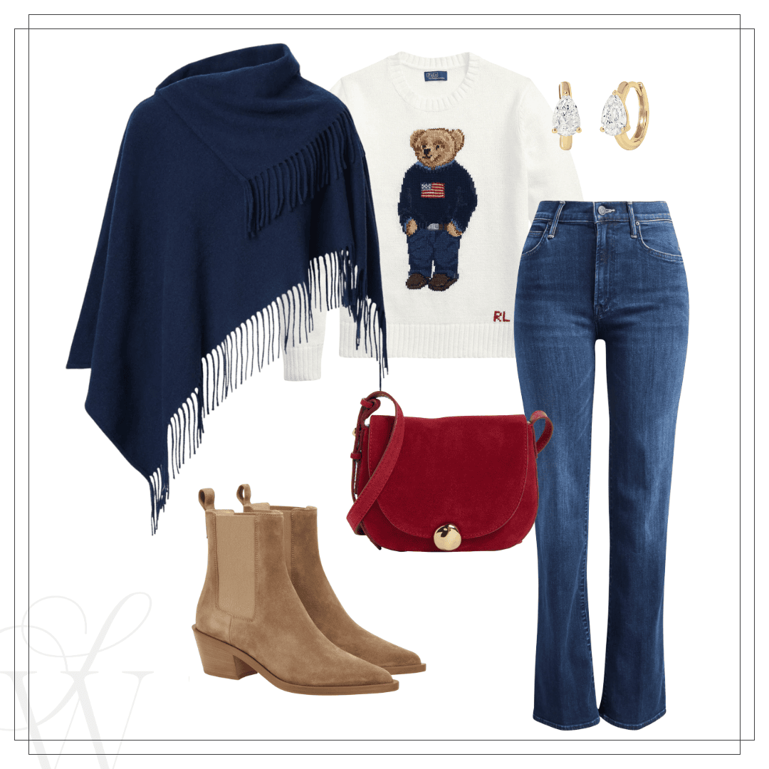 Left: Poncho | Bear sweater | Kick it jeans | Boots | Red bag | Earrings | Right: VB coat | Sweater | Kick it jeans | Suede bag | Boots