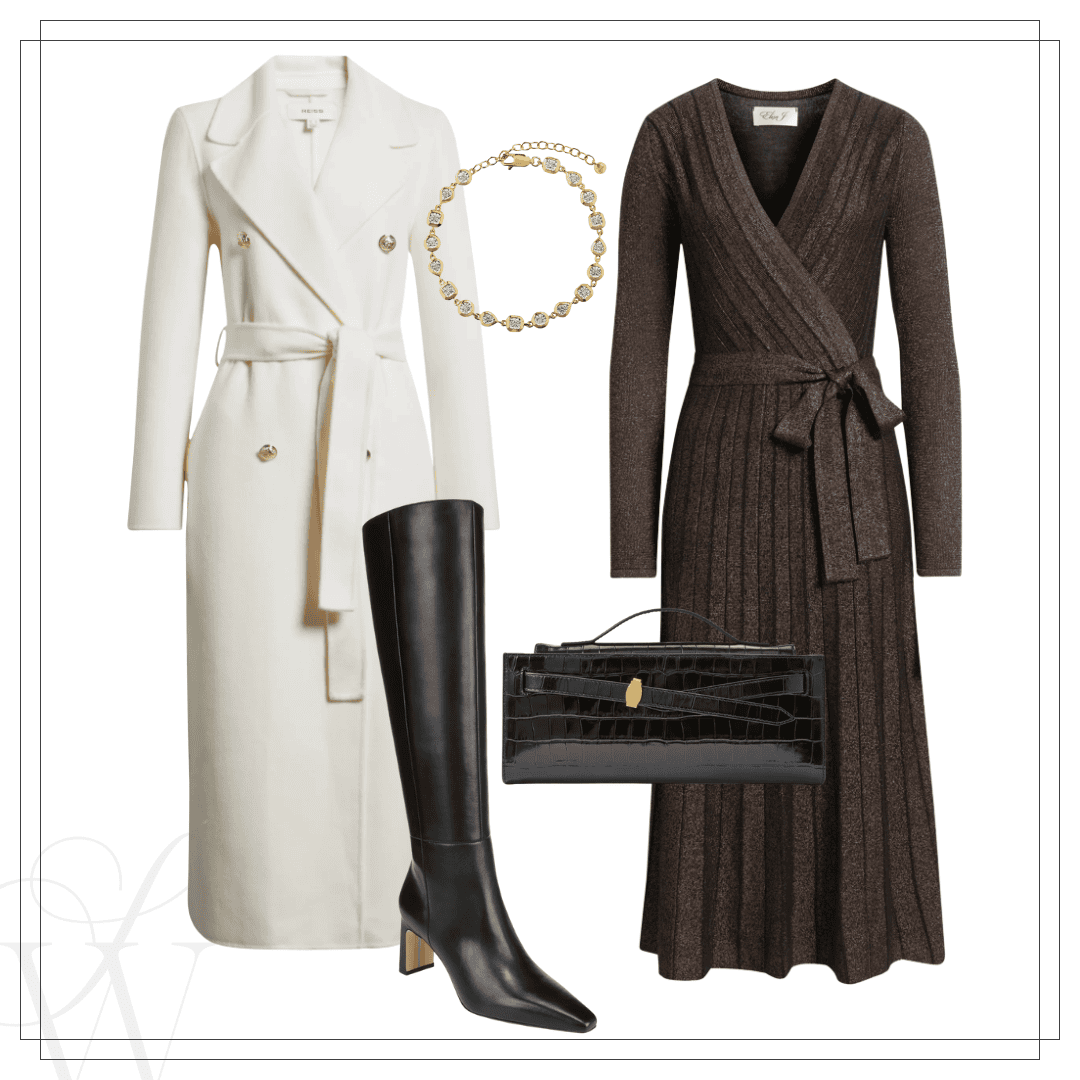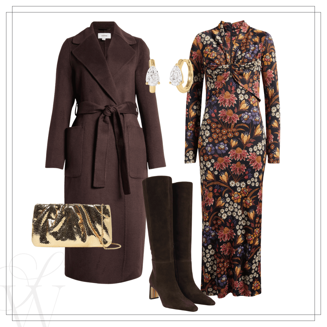 Left: Reiss coat | Farm Rio dress | Boots | Clutch | Earrings | Right: Reiss coat | Knit dress | Boots | Clutch | Bracelet