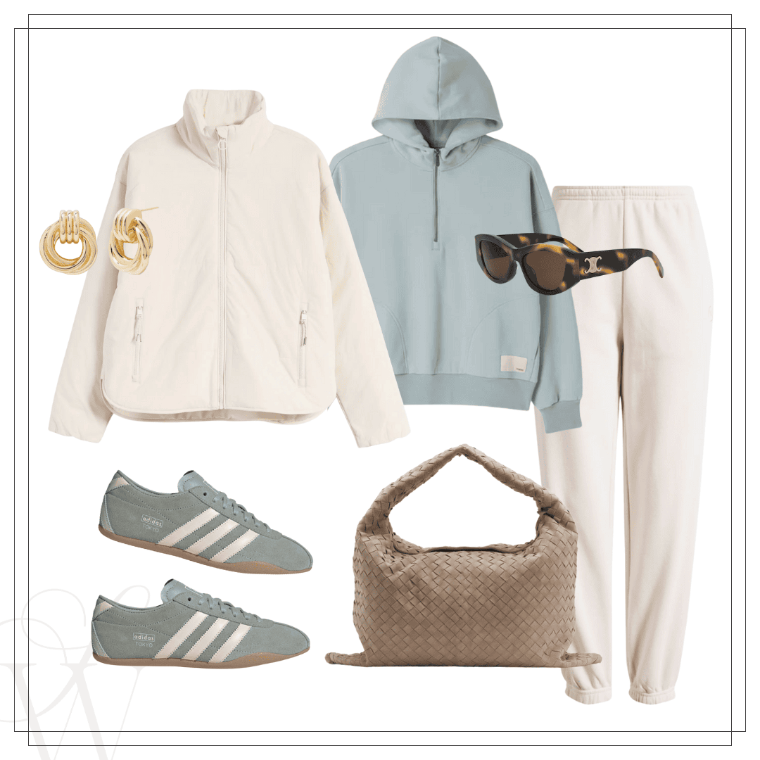 Right: Ivory zip up | Vuori half-zip | Joggers | Adidas sneakers | Purse | Sunnies | Earrings