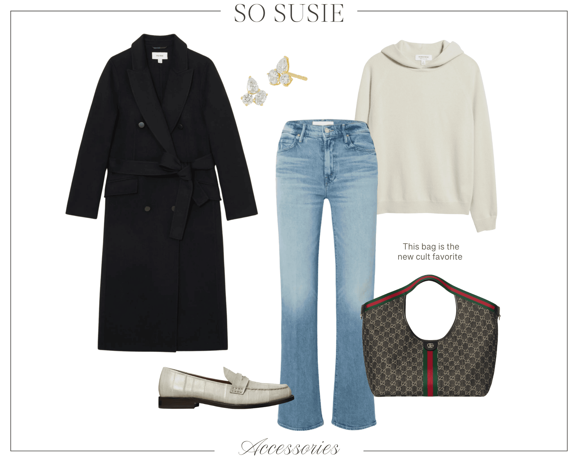 Reiss coat | Jeans | Cashmere hoodie | Earrings | Loafers | Gucci bag