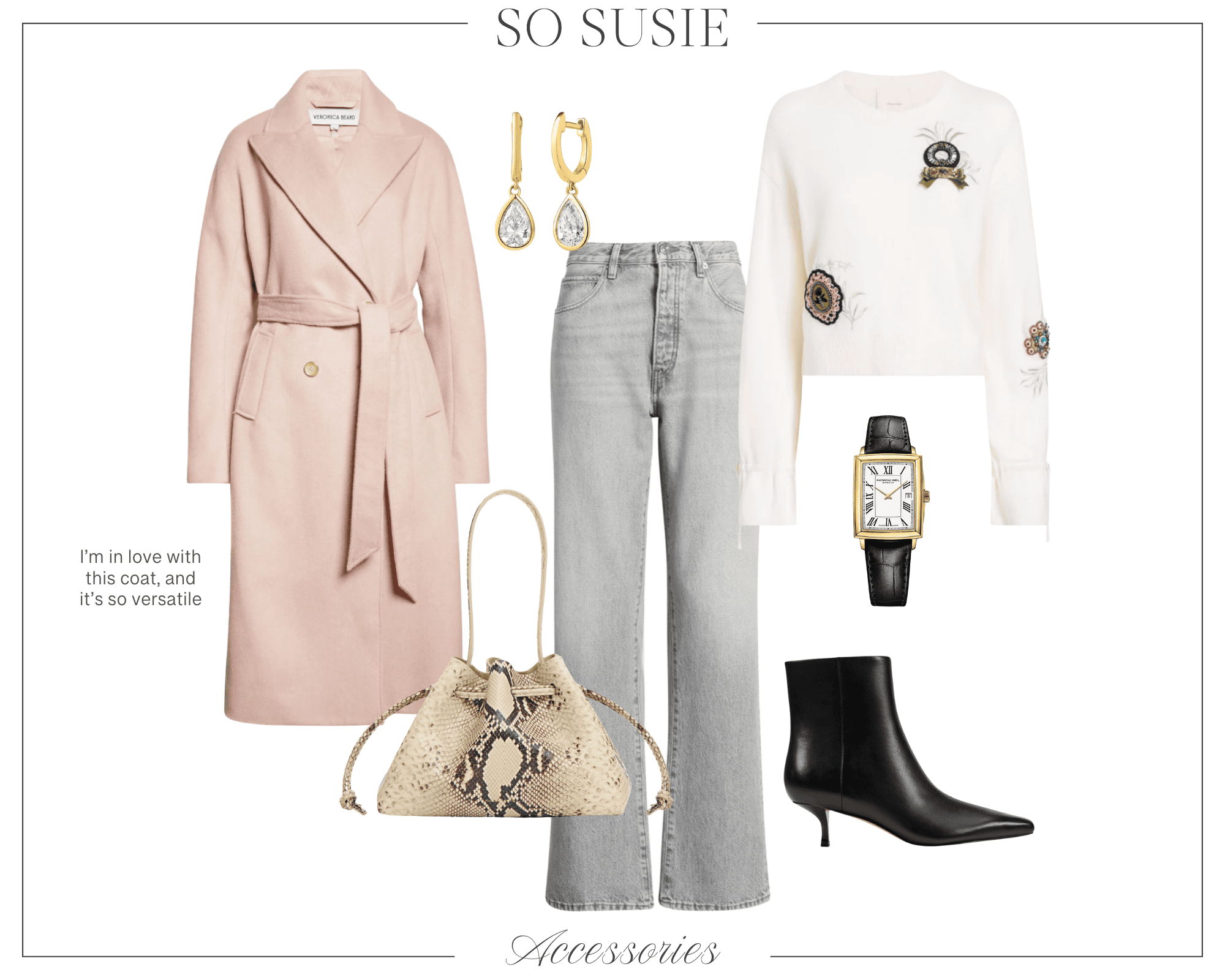Veronica Beard coat | Cinq a Sept sweater | Grey jeans | Snakeprint bag | Boots | Watch | Earrings