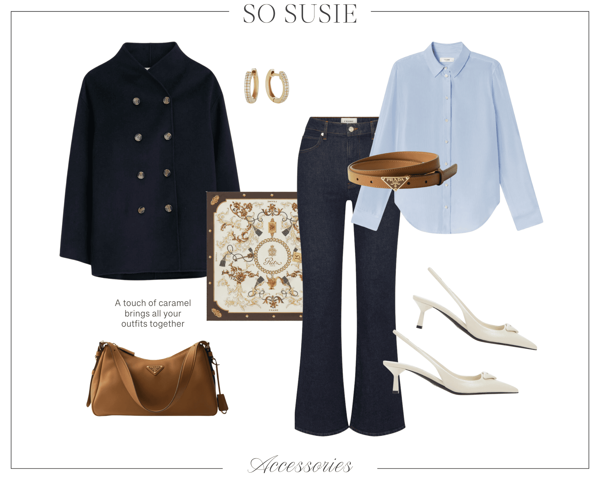 When it comes to building a beautiful wardrobe, a great collection of accessories is a category that’s often overlooked. And yet, it’s so so important! Consider accessories to be the finishing touch of all your outfits. Beautiful bags and scarves you love always elevate, and it’s a category I think is worth the investment. One very important thing to remember: you have little groupings that work together. For example, a caramel bag is a piece I highly recommend. Then a belt, or a shoe and scarf combo that tie it all together will give you outfit combinations for days!