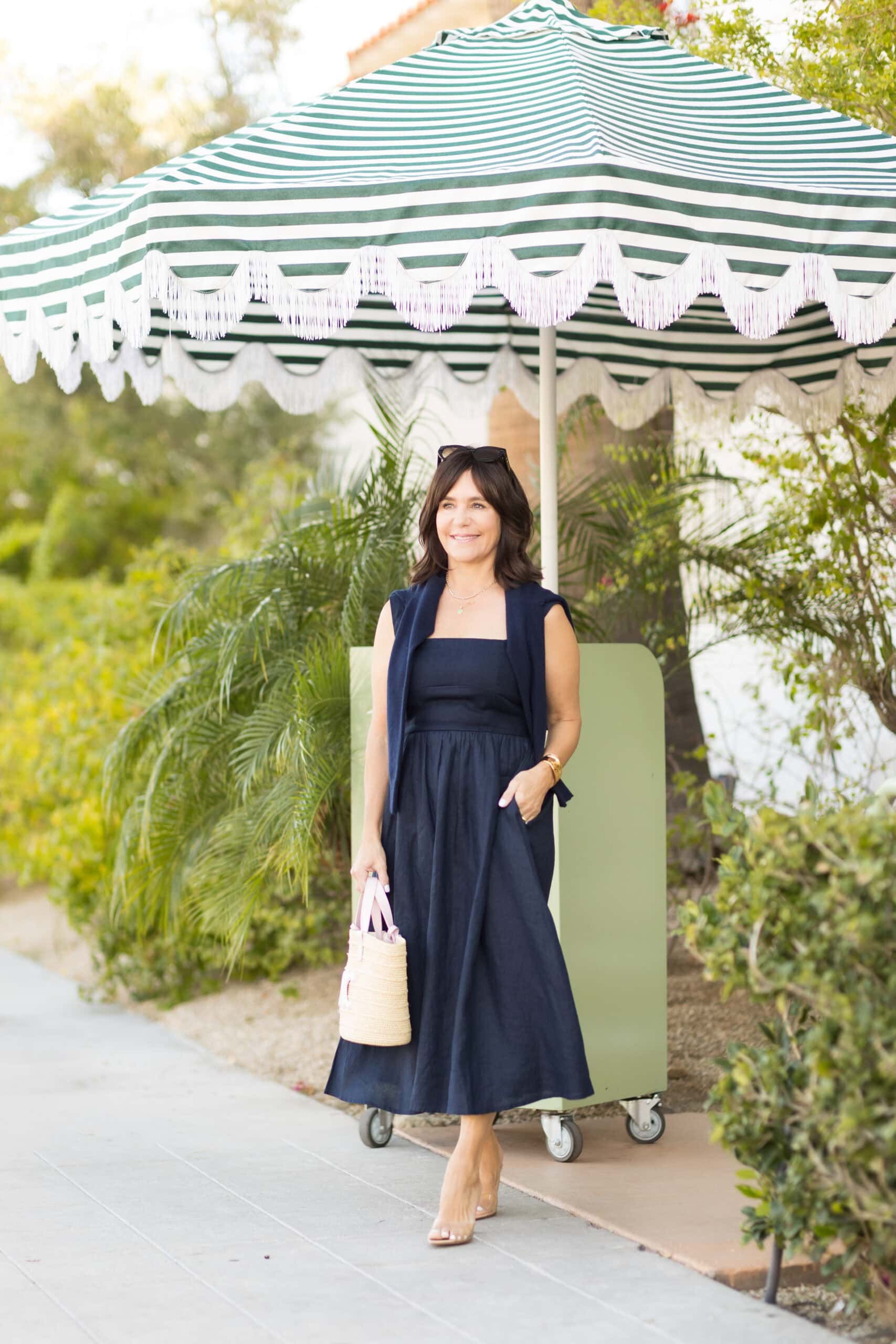Quince linen dress – This is another dress I wore all season long, and pretty much rotated between navy and the linen color. It’s a touch shorter than some of the other midi-style dresses, making it petite friendly. This slightly longer style is another best-seller that I also wore on repeat. Staud Phare silk dress – Last spring, I purchased this striped silk dress. It’s super flattering, and I wore it to several different events … and felt a little extra! So, when I noticed it in black recently, I decided to add it to the mix. Click here to see all the colors. And, for reference, it does run a size small, so size up. Alice & Olivia Lucy dress – This is one of Alice & Olivia’s best-selling styles and because of that, they add a new pattern every season. I just noticed this pretty brand-new print that’s perfect for warmer weather now. Since It’s on the shorter size, I sized up — and if you’re tall, you might find it too short.