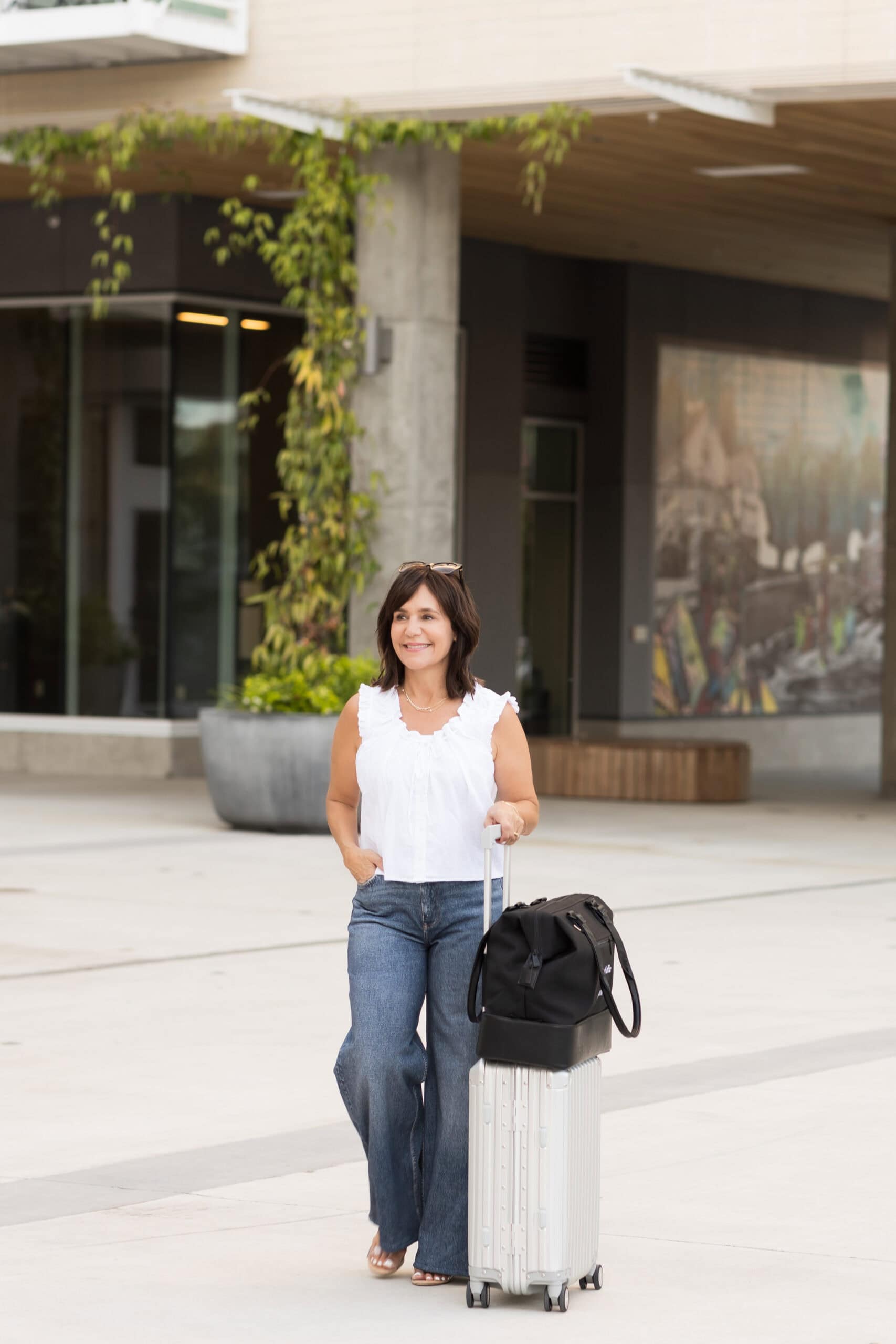 Aritzia Lodge pant – I can’t say enough good things about this pant, and it’s hands down my favorite pant purchase of the year! It’s a simple drawstring waist in the best crepe fabric that doesn’t wrinkle, and it washes up beautifully, making it the perfect pant for travel. It’s an update from leggings and equally as comfortable. Wear it on the plane with sneakers, and dress it up with sandals. This is a super versatile pant. And, if you’re tall or short, they make both options. For reference, I sized up to a small.
