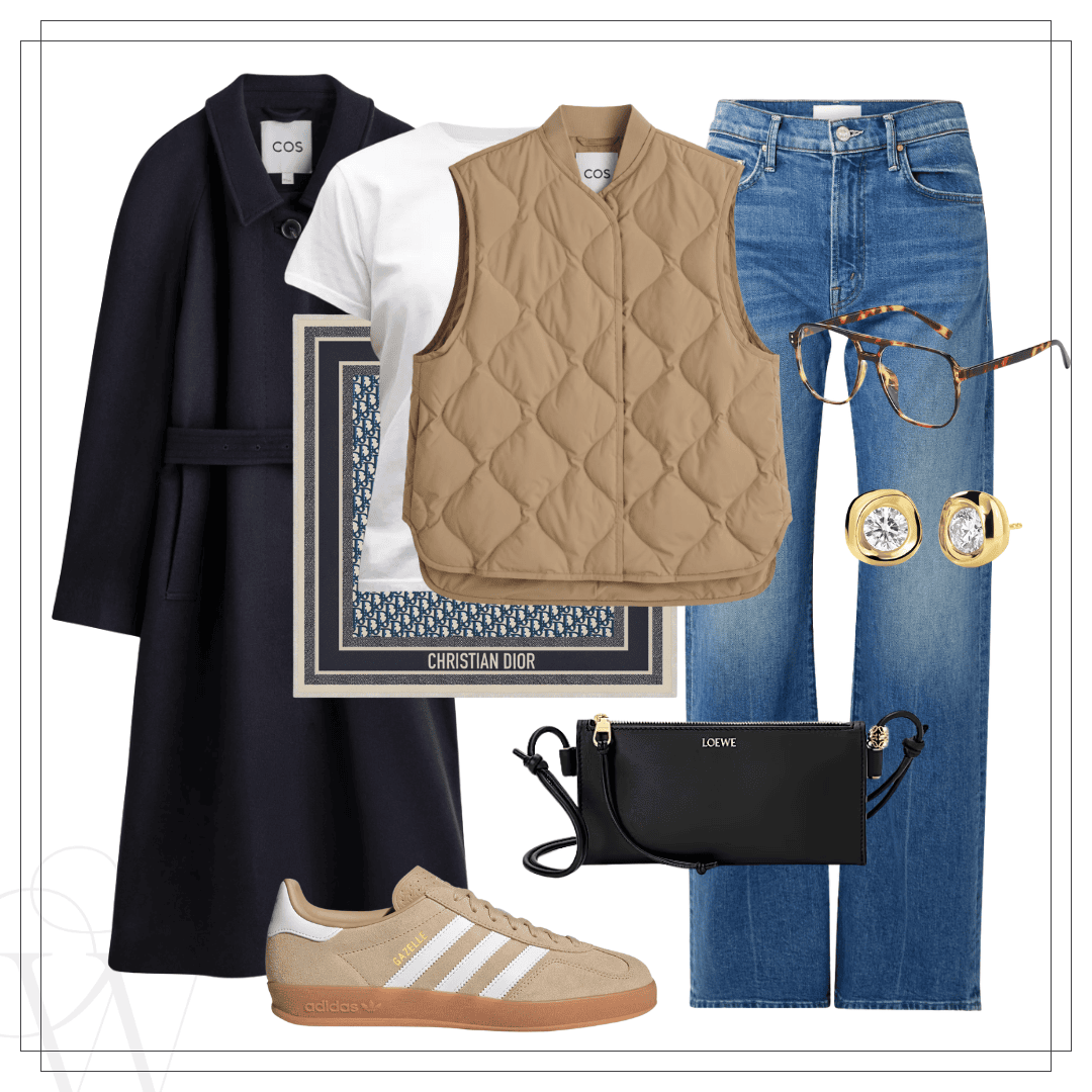 COS coat | White tee | COS gillet | Mother Lasso jeans | Dior scarf | Adidias | Loewe bag | Earrings