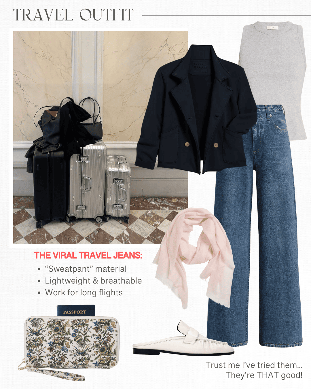 These viral sweatpants that look like jeans, and disguised as loungewear, they’re the best travel pants around!! They’re actually a printed terrycloth fabric, and you’ll find them to be extremely comfortable. The wide-leg Sophie style is the best-selling one to consider, however, I find them a little too wide for me. Check out this slimmer fit above, this new wide-leg style that’s not too wide, and this new boot cut style that’s also a knit fabric, just not the terrycloth!