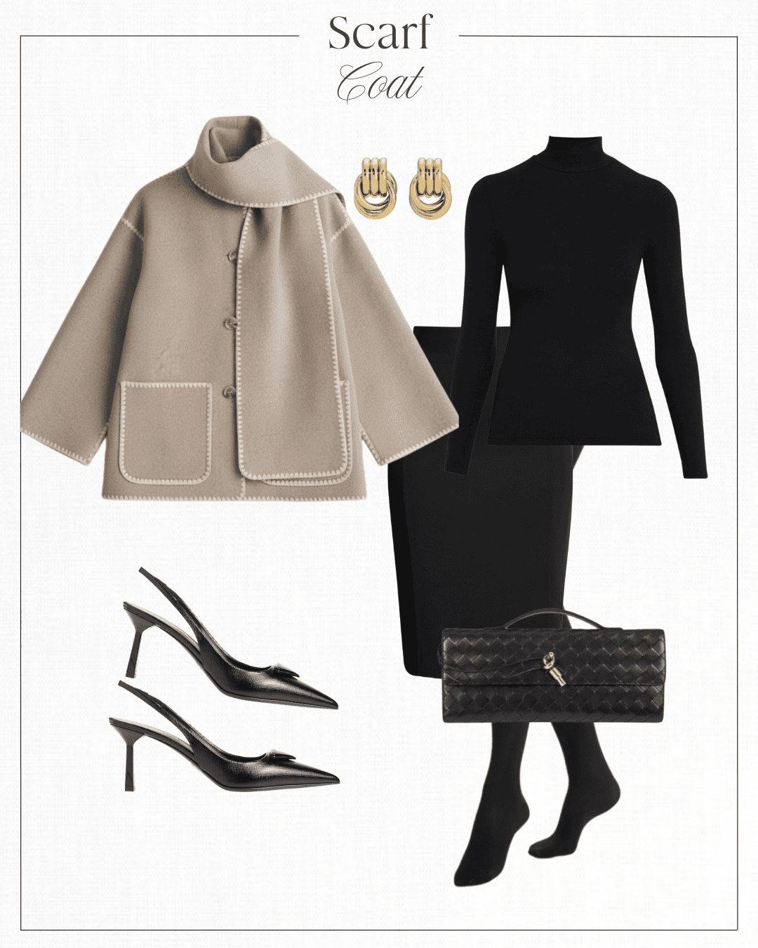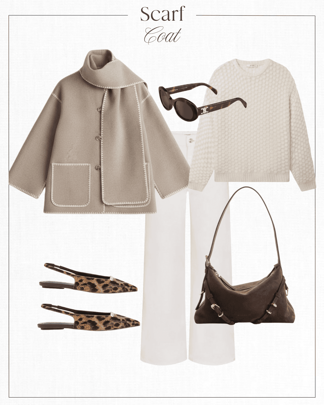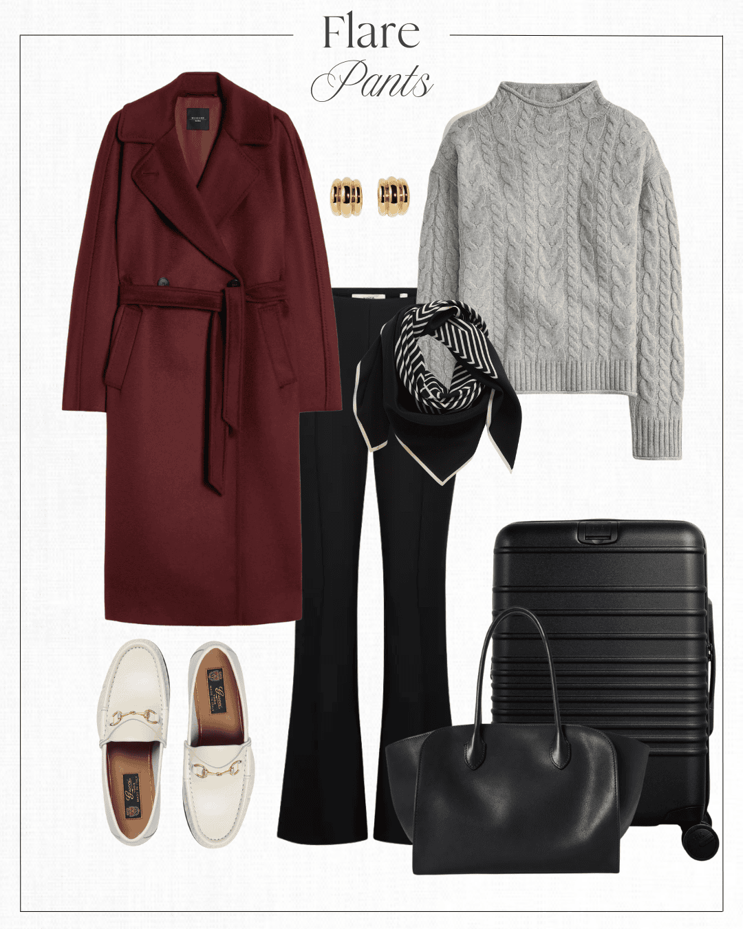 Left: Max Mara wrap | J.Crew sweater | Vince pant | Gucci loafers | The Row tote | Beis luggage | Scarf