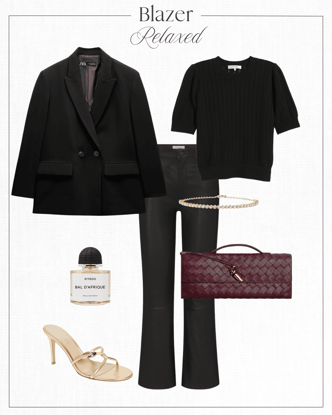 LouLou Saison blazer | Frame leather pants | Gold sandals | Burgandy clutch, similar | Frame sweater | Necklaces: here & here