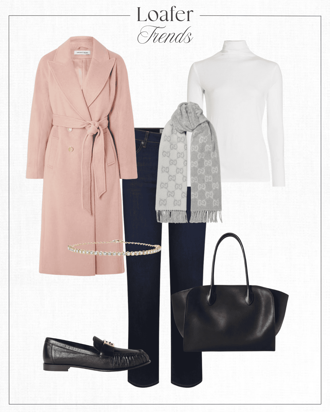 Veronica Beard coat | White turtleneck | Frame Straight leg jeans | Fendi loafers | The Row tote | Bracelet | Gucci scarf