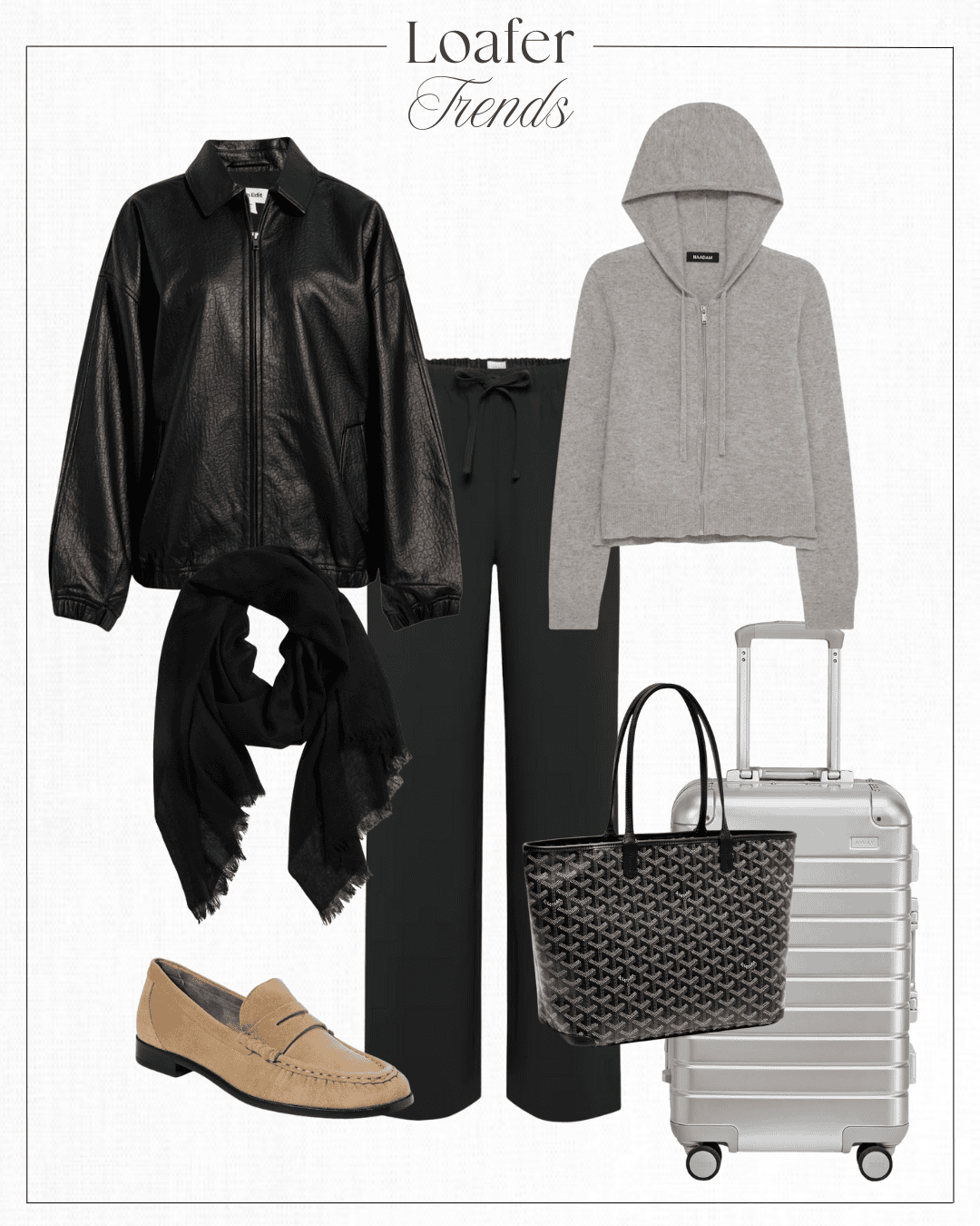 Left: Faux leather jacket | Cashmere hoodie | Drawstring pant | Scarf | Luggage | Loafer | Tote