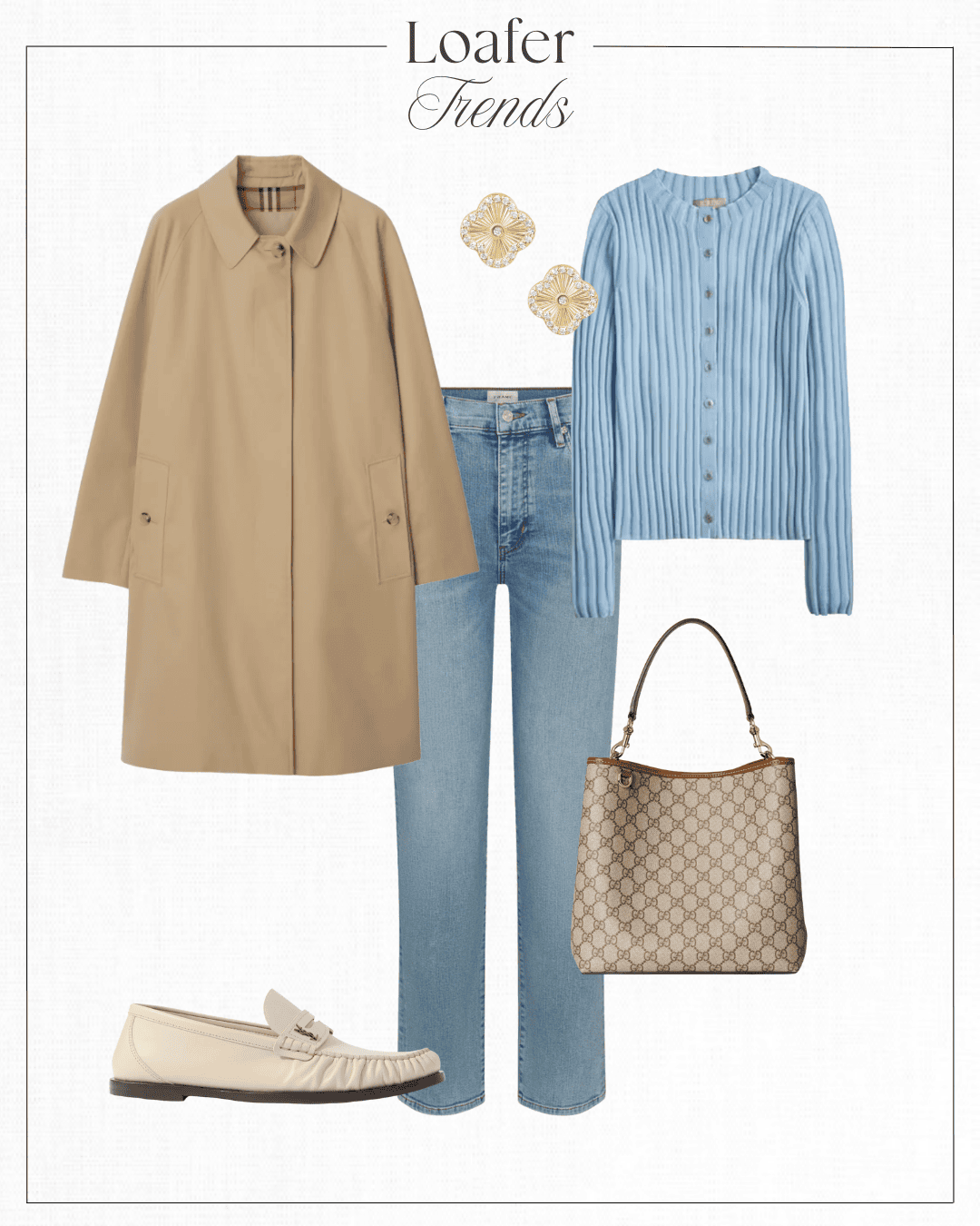 Right: Burberry car coat | Frame jeans | YSL loafers | Gucci bag | Earrings | Blue sweater