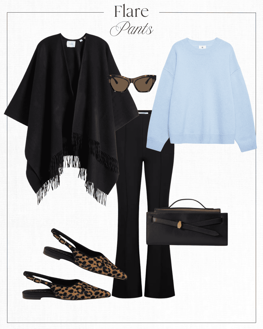 Vince wrap | Vince flare pant | Blue sweater | Slingbacks | Clutch