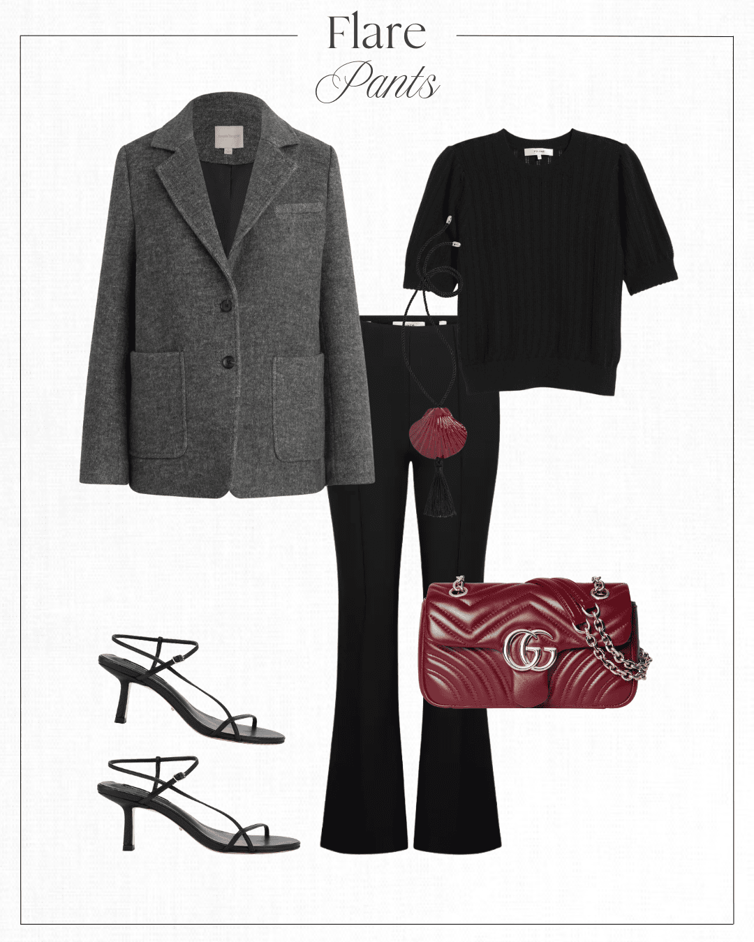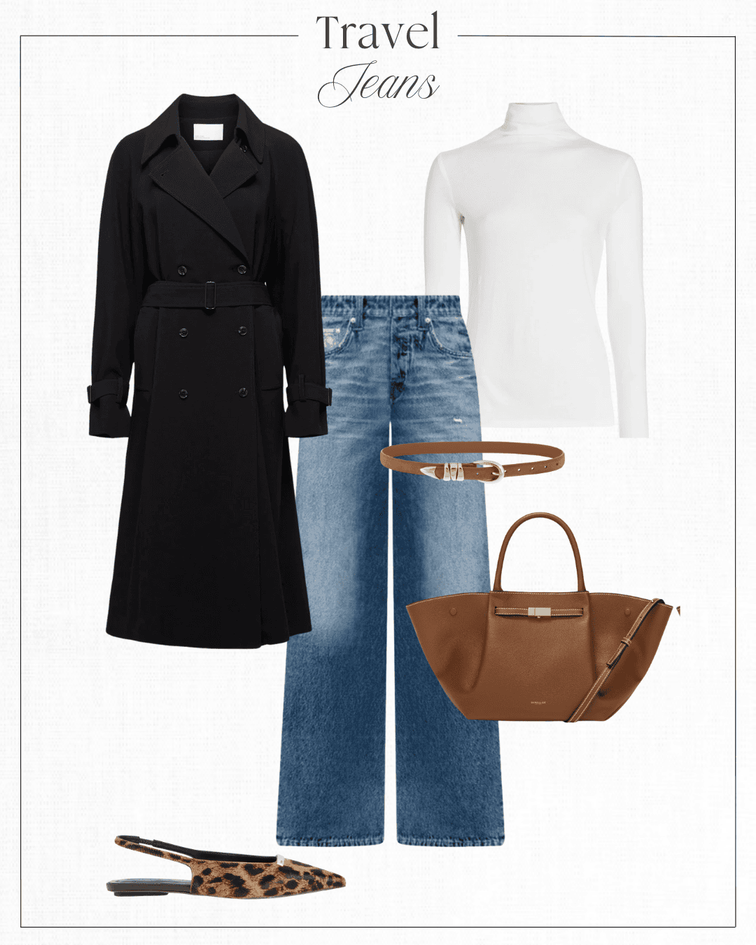Travel jeans | Scarf coat | Relaxed black blazer | Black ankle flare pants | Loafers