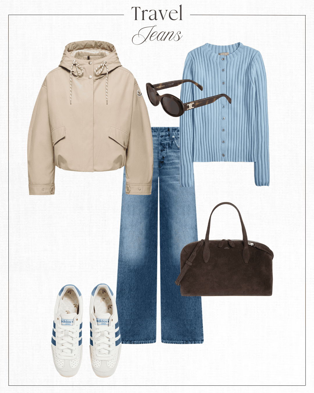 Left: Moncler jacket | Blue sweater | Miramar jeans | Suede bag | Adidas | Sunnies