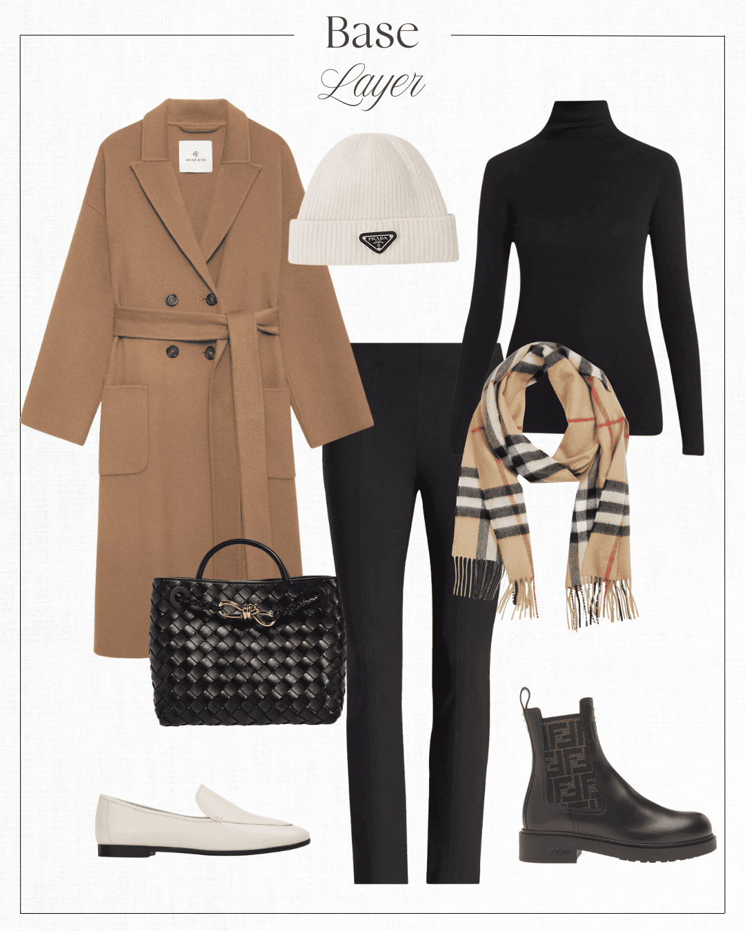 Left: Leather jacket, similar | Vince trousers | Turtleneck | Right: Anine Bing coat | Prada hat | Burberry scarf | Turtleneck | Vince pants | Bottega bag | Loafers | Boots