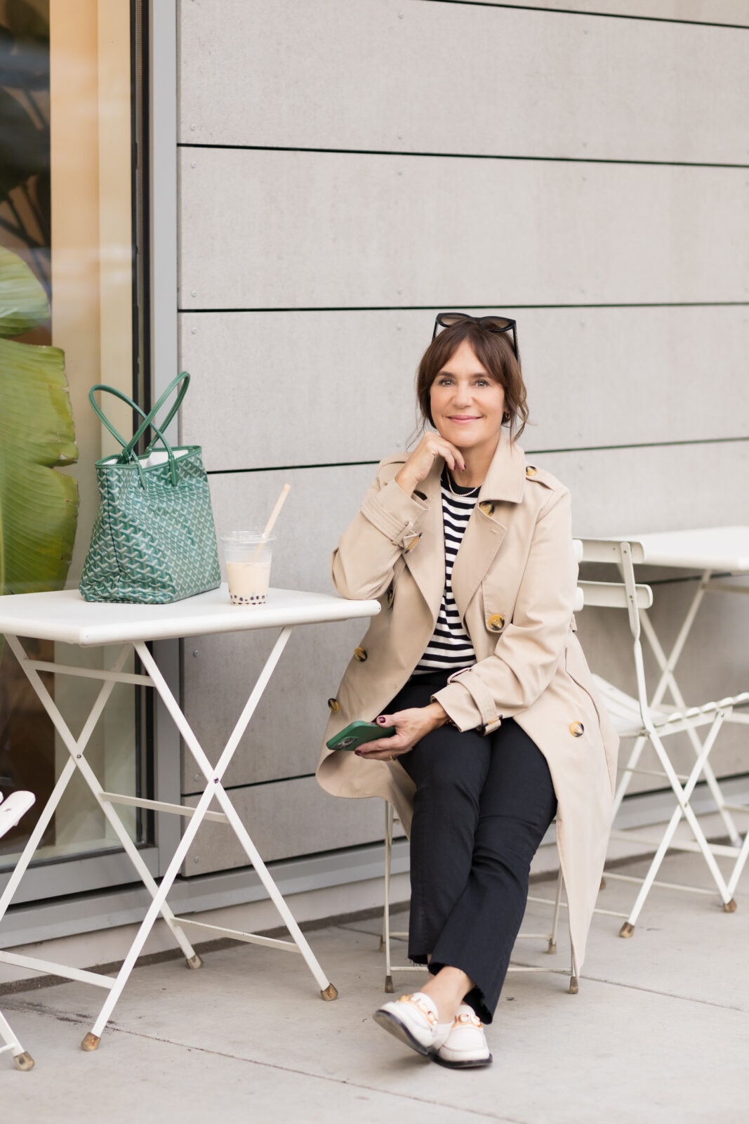It’s cold! Trench | Striped top, simiilar | Black Mother jeans | Gucci loafers, similar here | Green Goyard bag