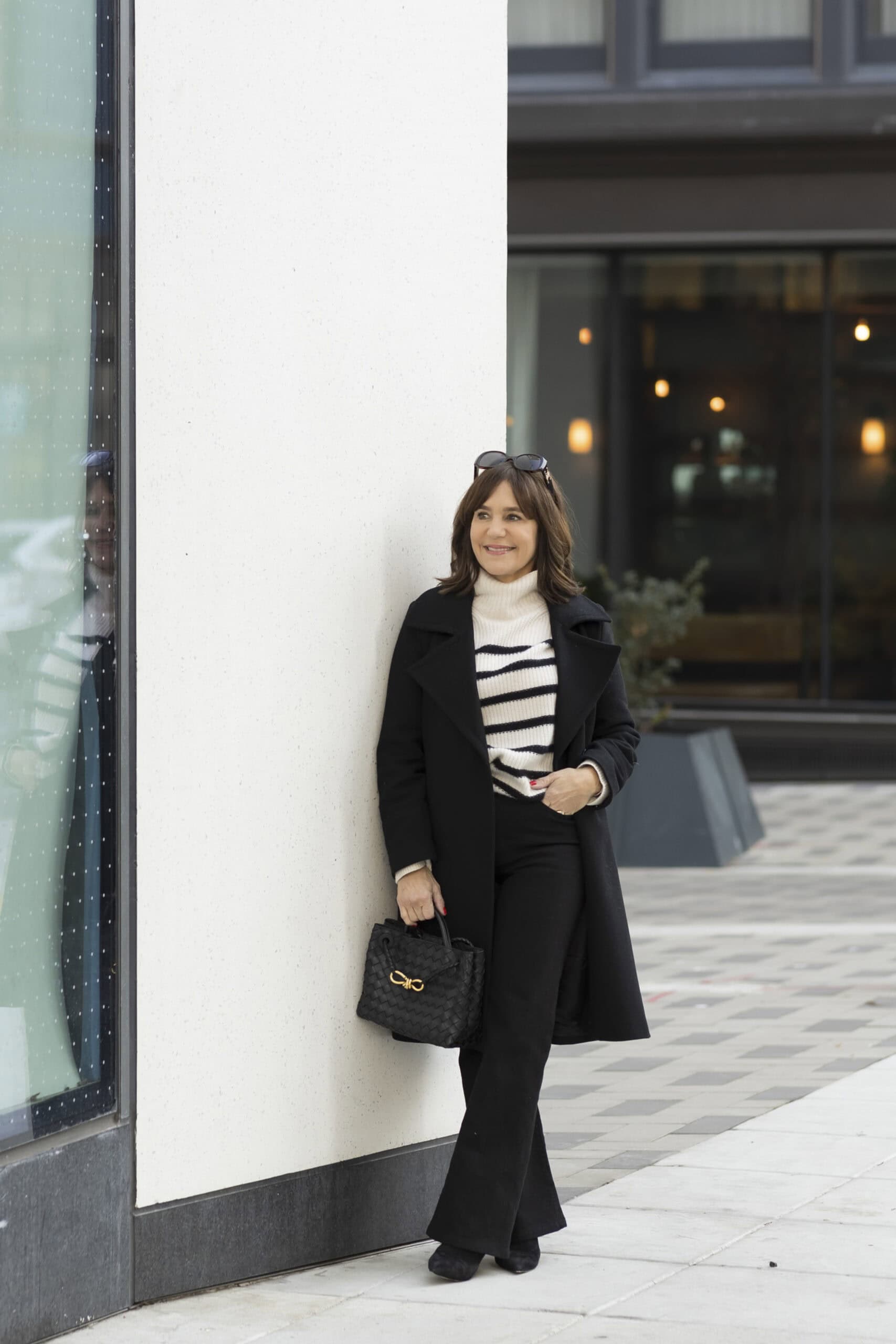 Left: Aritzia coat | Stripe sweater | Right: Reiss coat | Frame jeans | Sweater