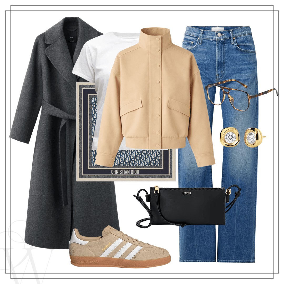 Left: Mango coat | White tee | COS gillet | Mother Lasso jeans | Dior scarf | Adidias | Loewe bag | Earrings | Right: COS coat | Denim jacket | Anessa jeans | Gucci bag | Flats