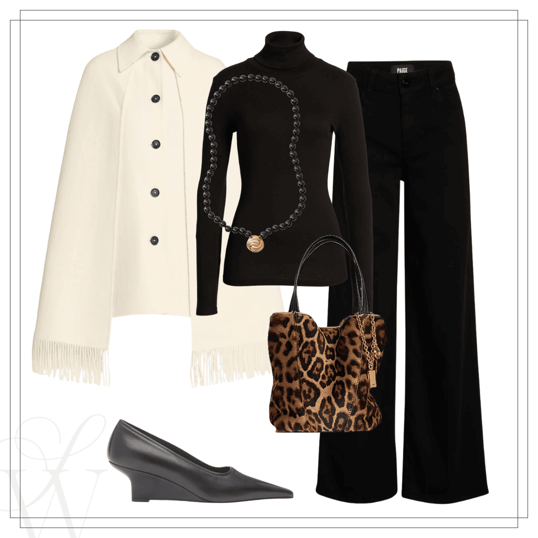 Left: Navy jacket | TWP shirt | Paige Anessa | Tennis necklace | VB clutch | Flats | Right: Toteme cape coat | Turtleneck | Julietta necklace | Paige Anessa | Toteme wedge shoe | Chloe leopard bag