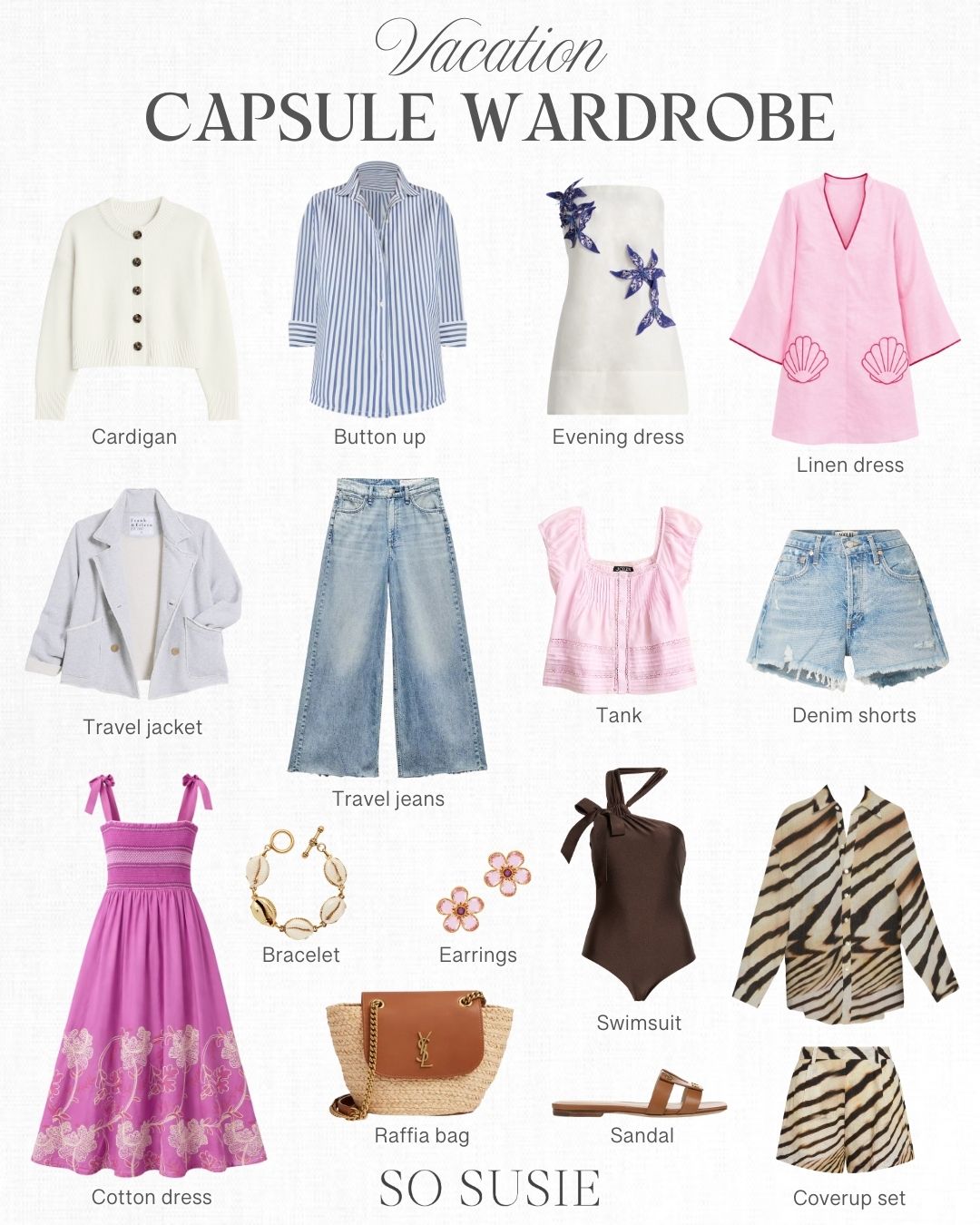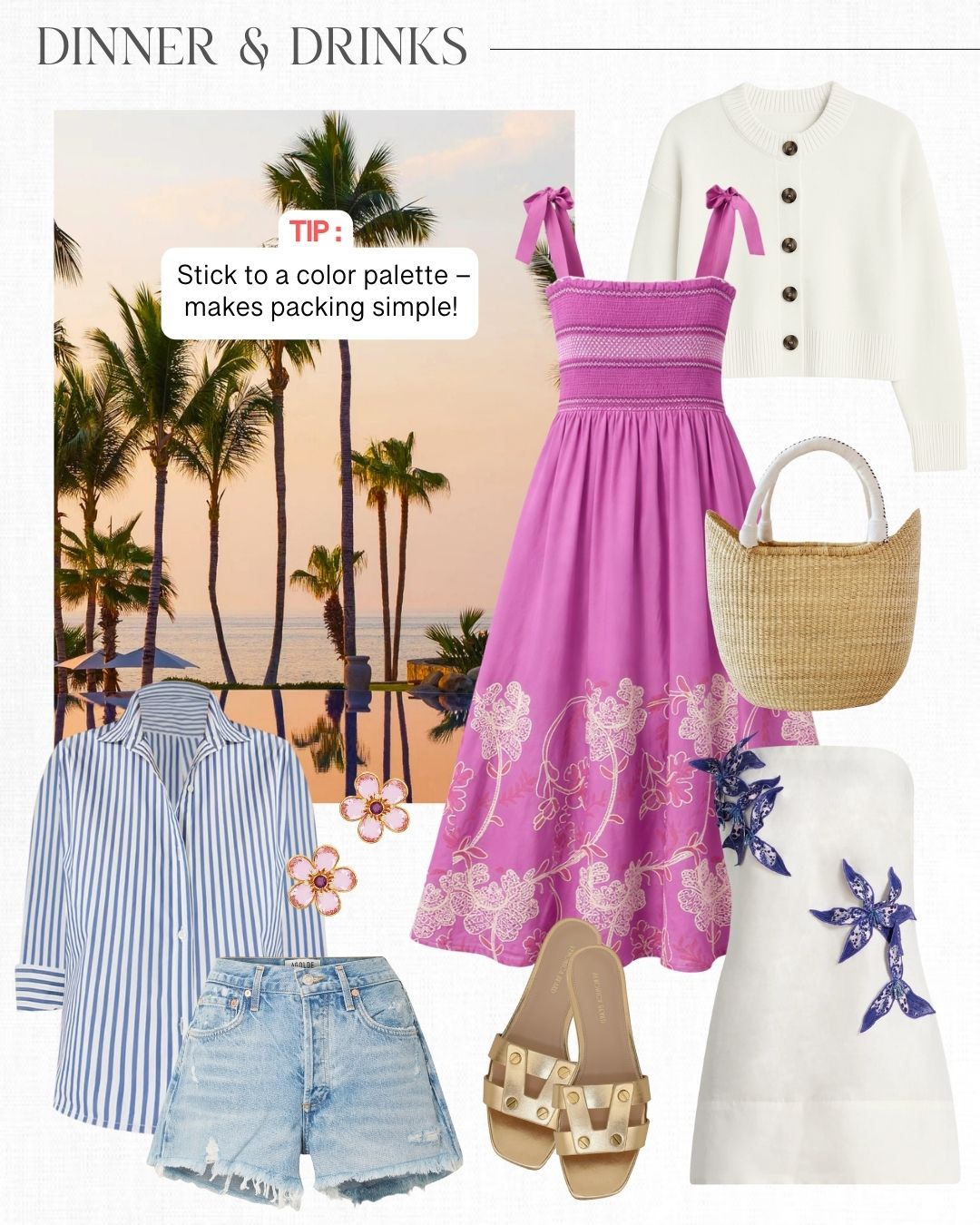 Bottom row: Cotton sundress | Shell bracelet | Pink earrings | Raffia bag | Swimsuit | Sandal | Tiger linen shirt & short