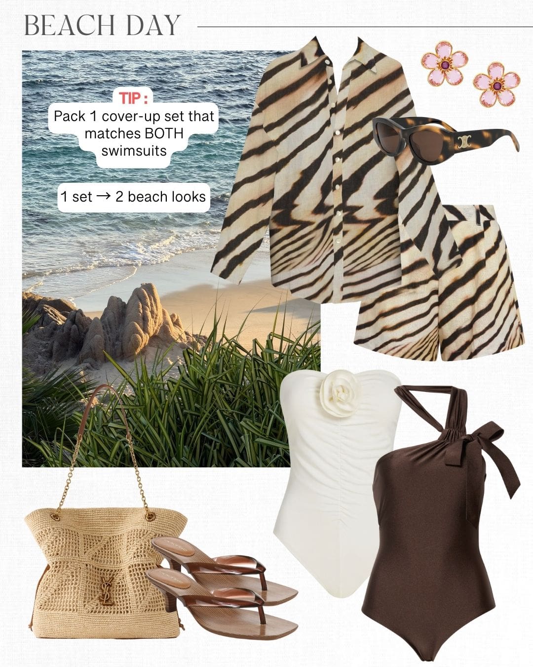 Animal print cover up & shorts | Sunglasses | Earrings | White swimsuit | Brown swimsuit | Raffia tote | Sandals