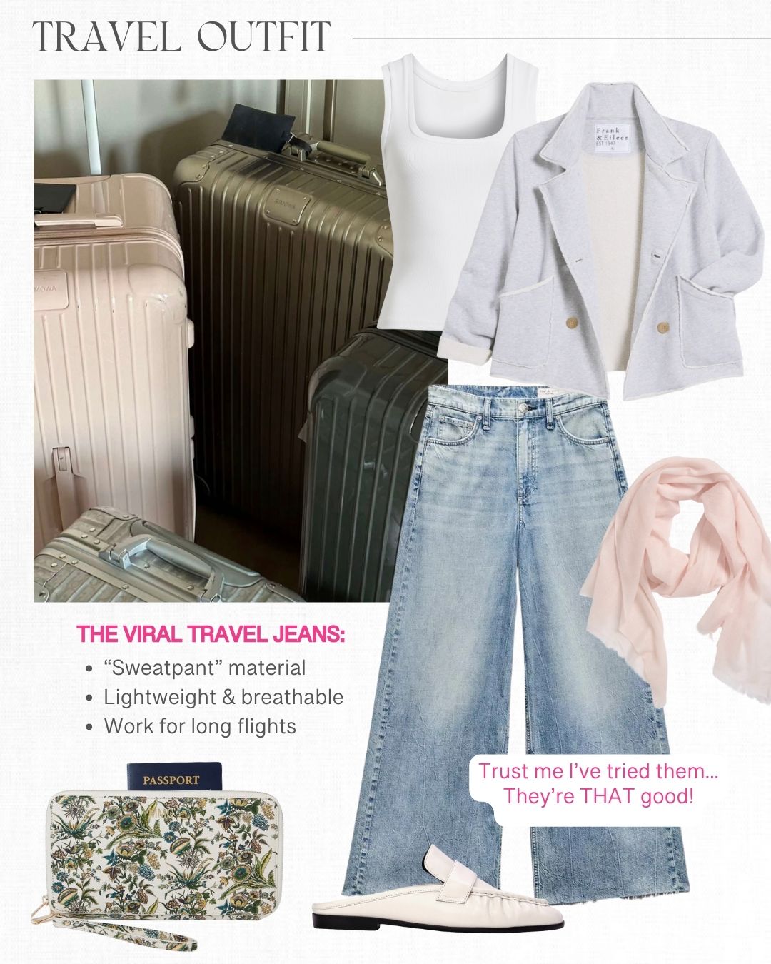 Second row: Frank & Eileen jacket | Sophie Miramar jeans | Pink top | Denim shorts