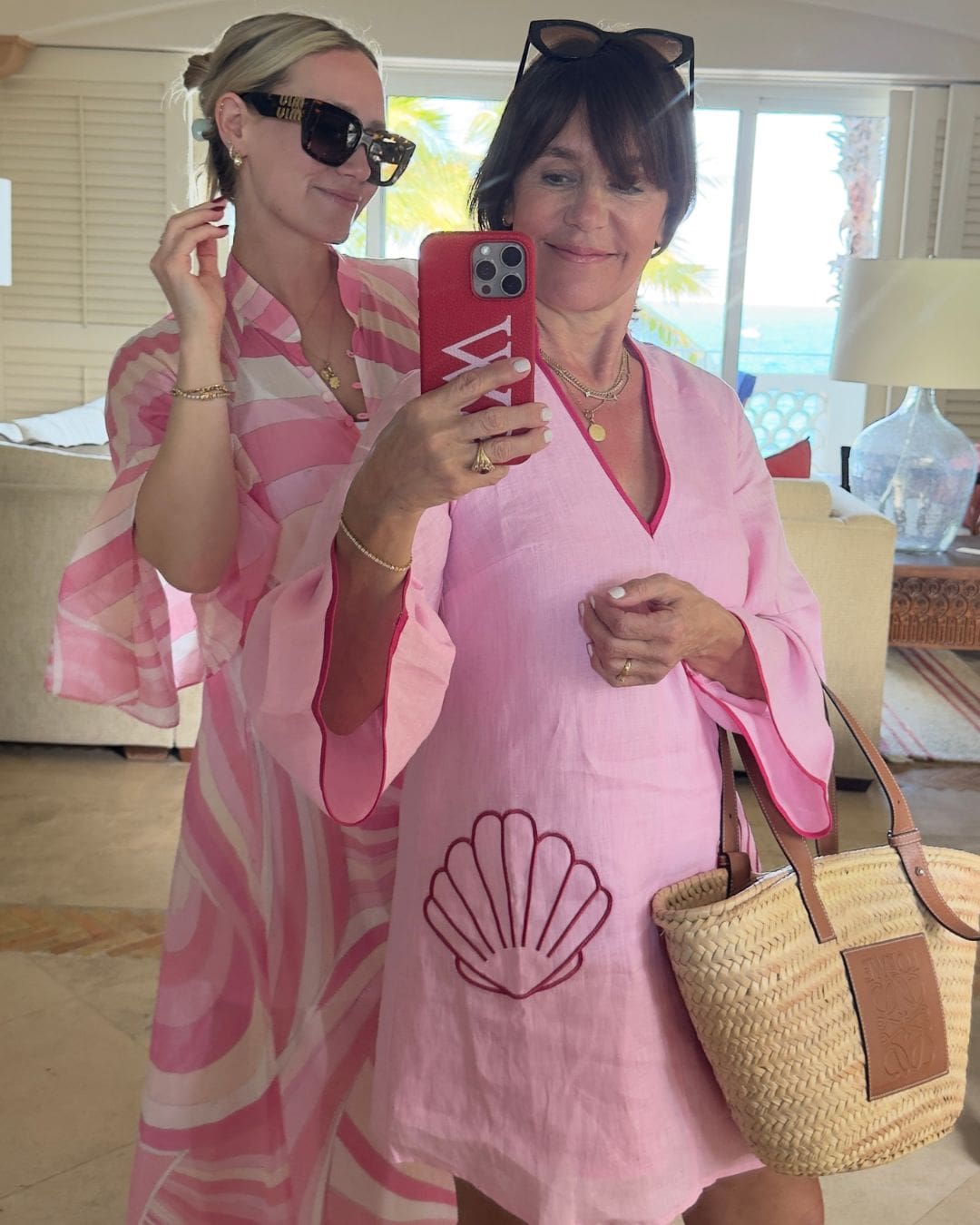 Pack & Wear: Left: Dress | Swimsuit | Sandals | Bag | Earrings | Body oil | Susie: Pink dress | Basket bag | Phone case | Emily: Pucci dress, similar