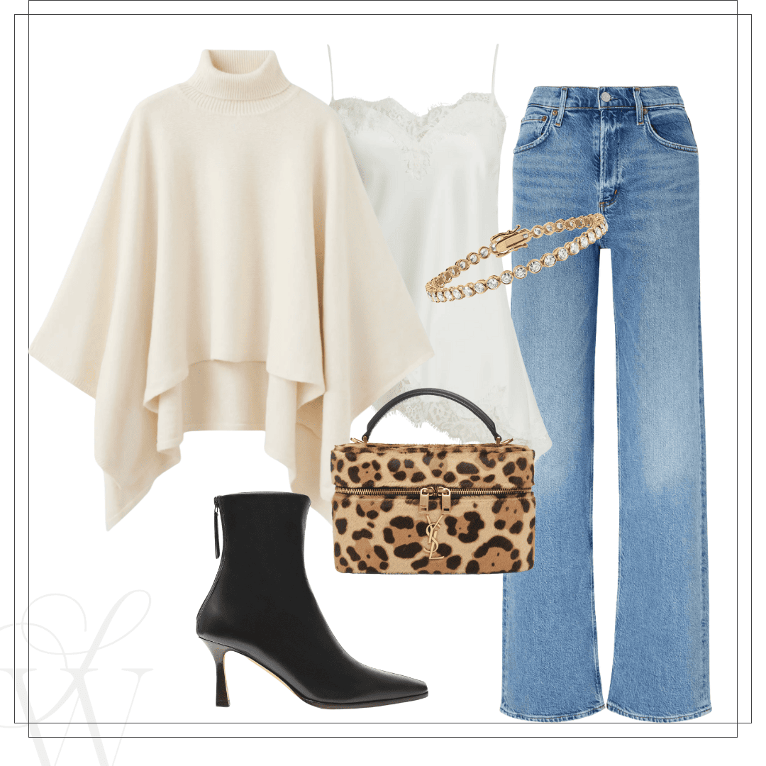 Left: Mango cape | Cami | Bracelet | Leopard bag | Boots | AGOLDE jeans
