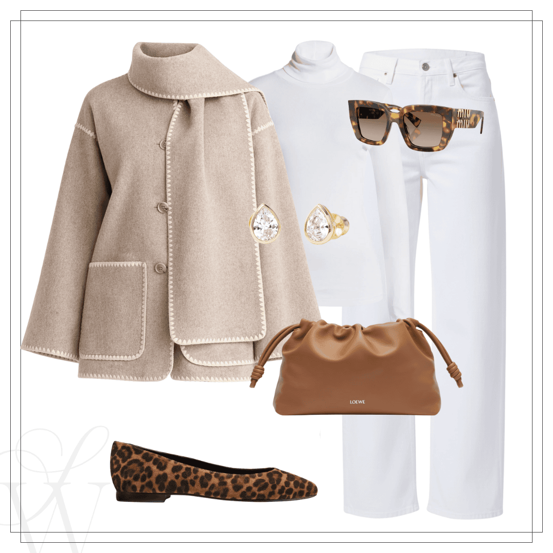 Left: Quince scarf jacket | White turtleneck | AGOLDE jeans | Leopard flats – or here | Sunglasses | Earrings | Loewe bag
