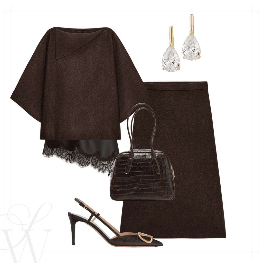 Right: Zara sweater & matching skirt | Black lace cami | Bag | Slingbacks | Earrings
