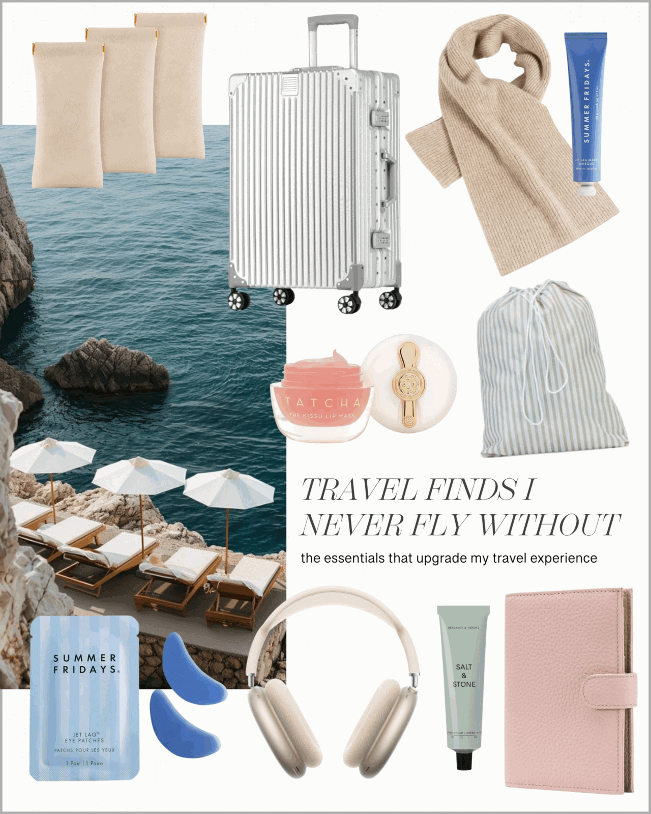 Never without: Sunglasses sleeve | Suitcase | Cashmere scarf | Summer Fridays Jet Lag Masque | Tatcha lip mask | Laundry bag | Eye patches | Apple headphones | Hand lotion | Passport case