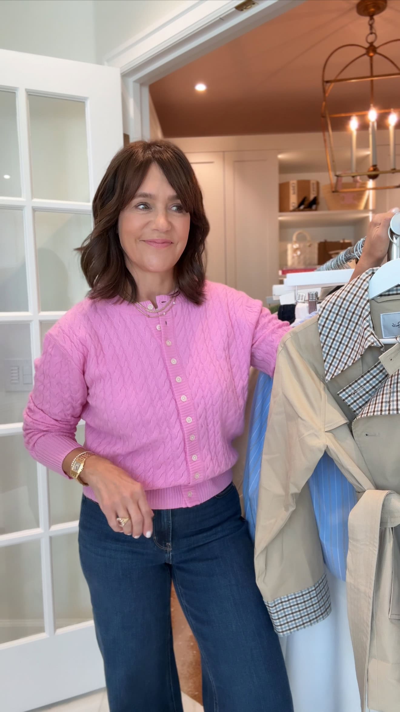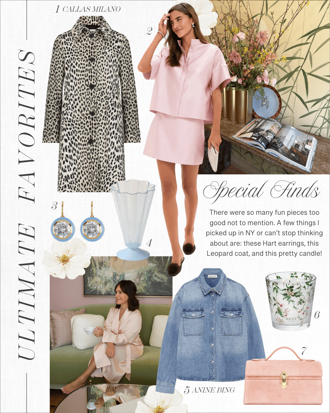 Leopard jacket | Pink top & matching skirt | Earrings | Vase | Denim shirt | Nest candle | Pink Savette bag
