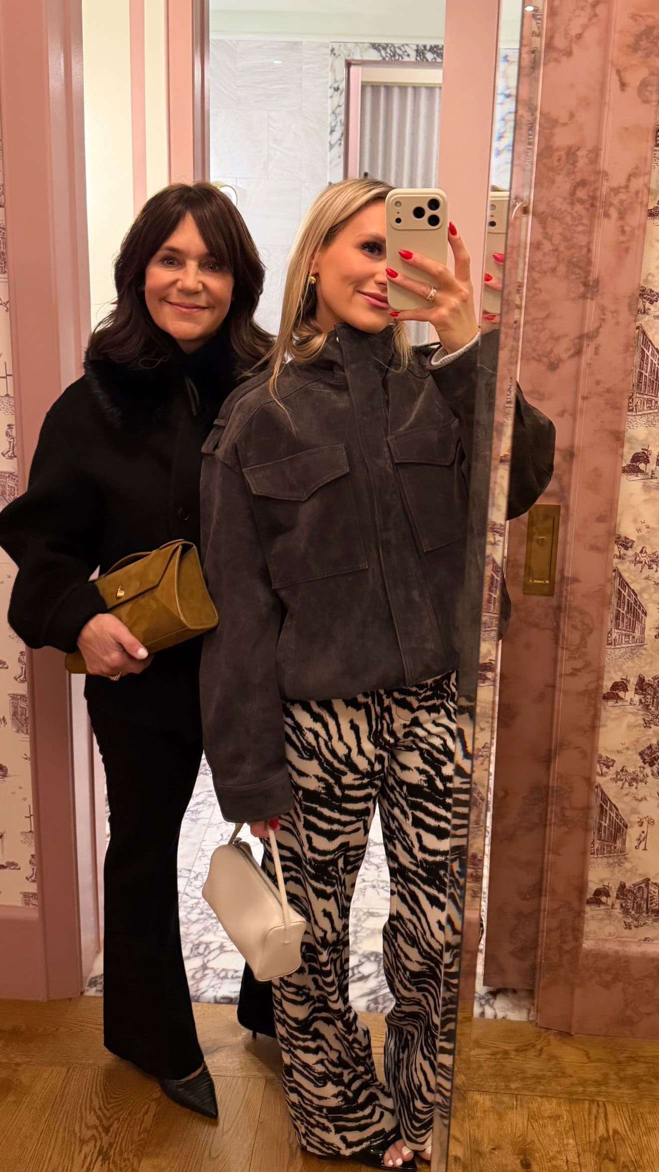 Left photo: Em’s coat | Loafers | Jeans | My coat | 1/2 zip cashmere | Right photo: My fur collar | Ponte pants | Emily Zara bomber, navy here | Amazon bag | Zebra pants old, similar